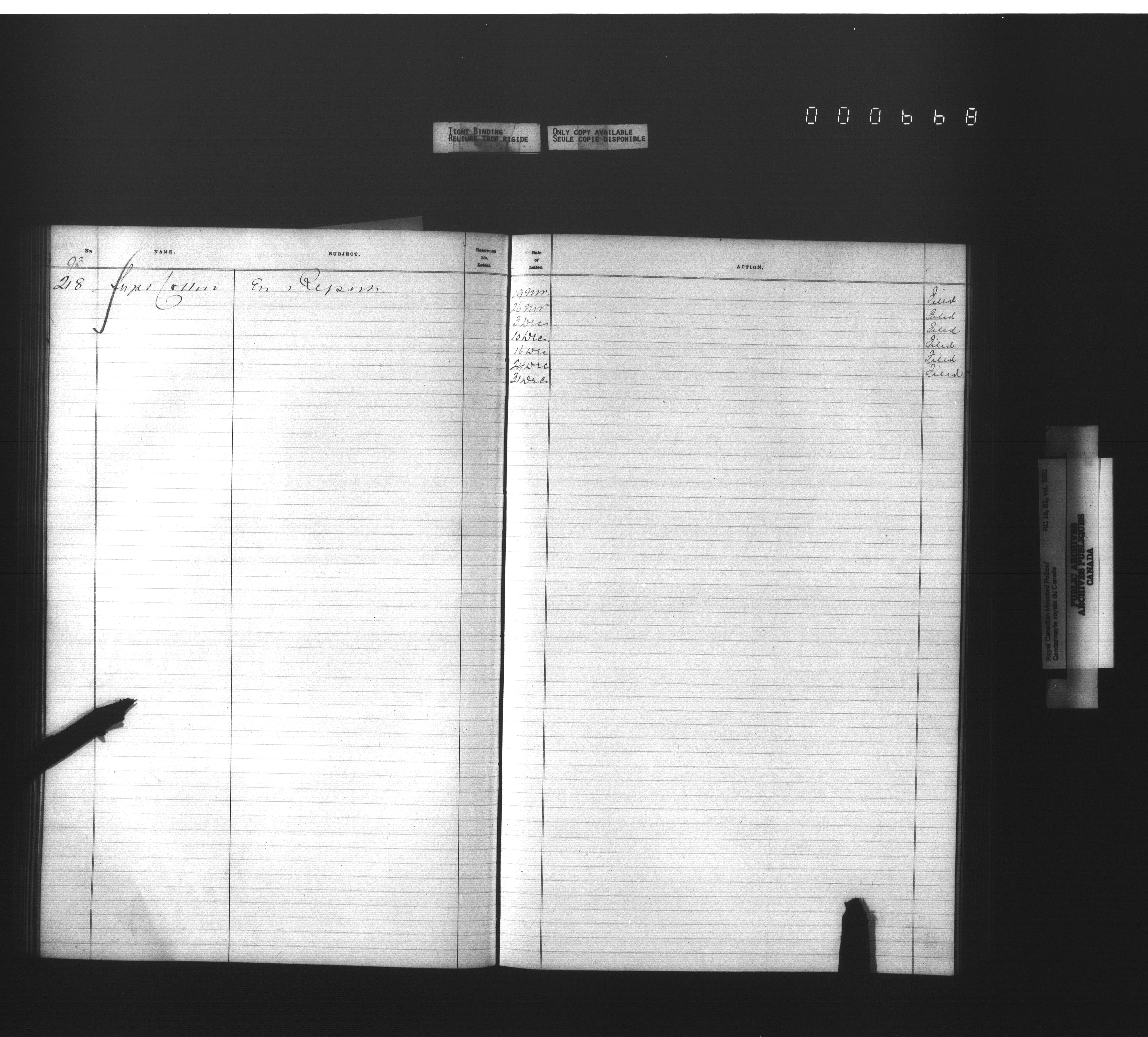 Royal Canadian Mounted Police, Office of the Commissioner: official correspondence: indexes and registers, 1876-1920 : T-4478