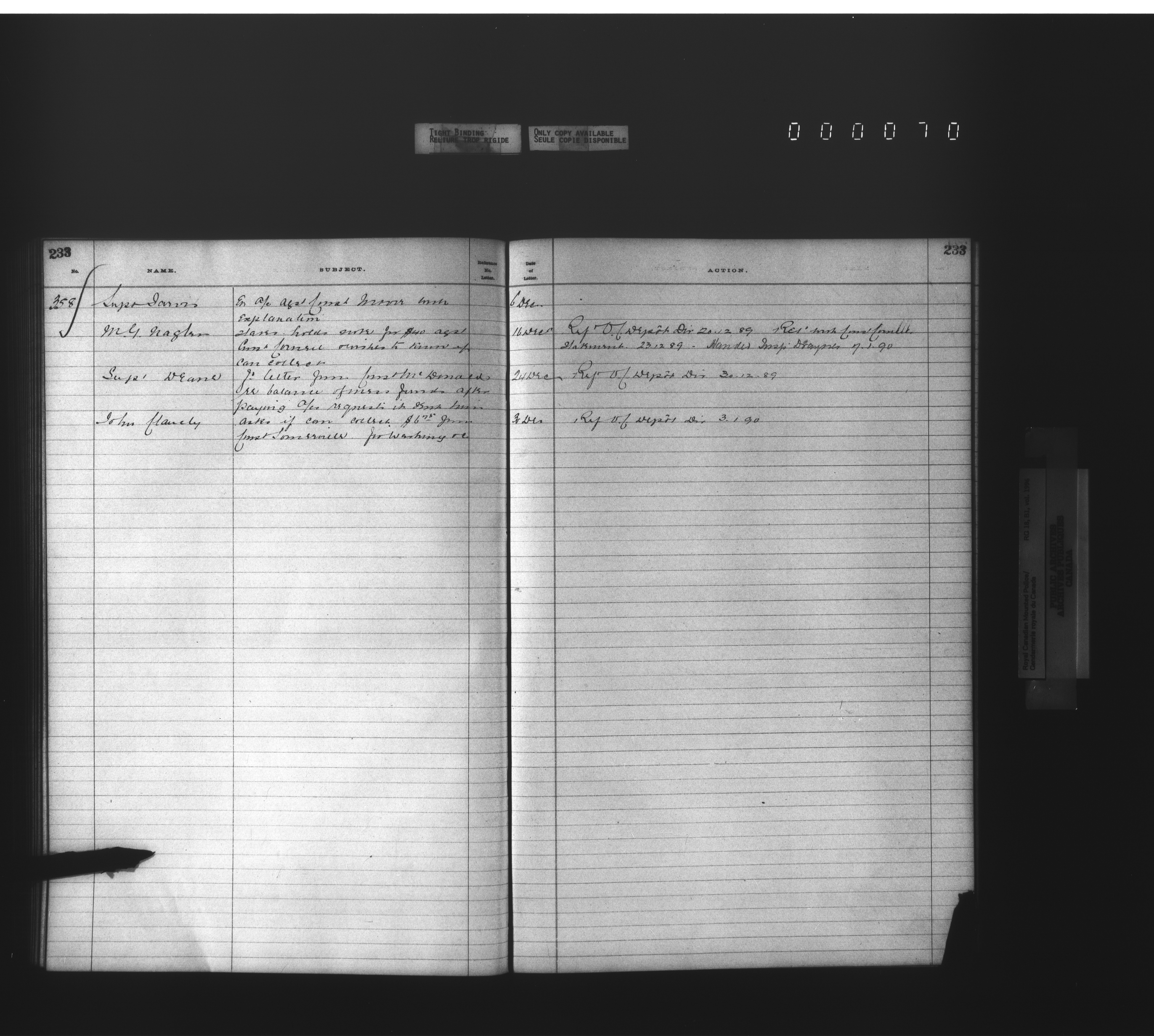 Royal Canadian Mounted Police, Office of the Commissioner: official correspondence: indexes and registers, 1876-1920 : T-4478