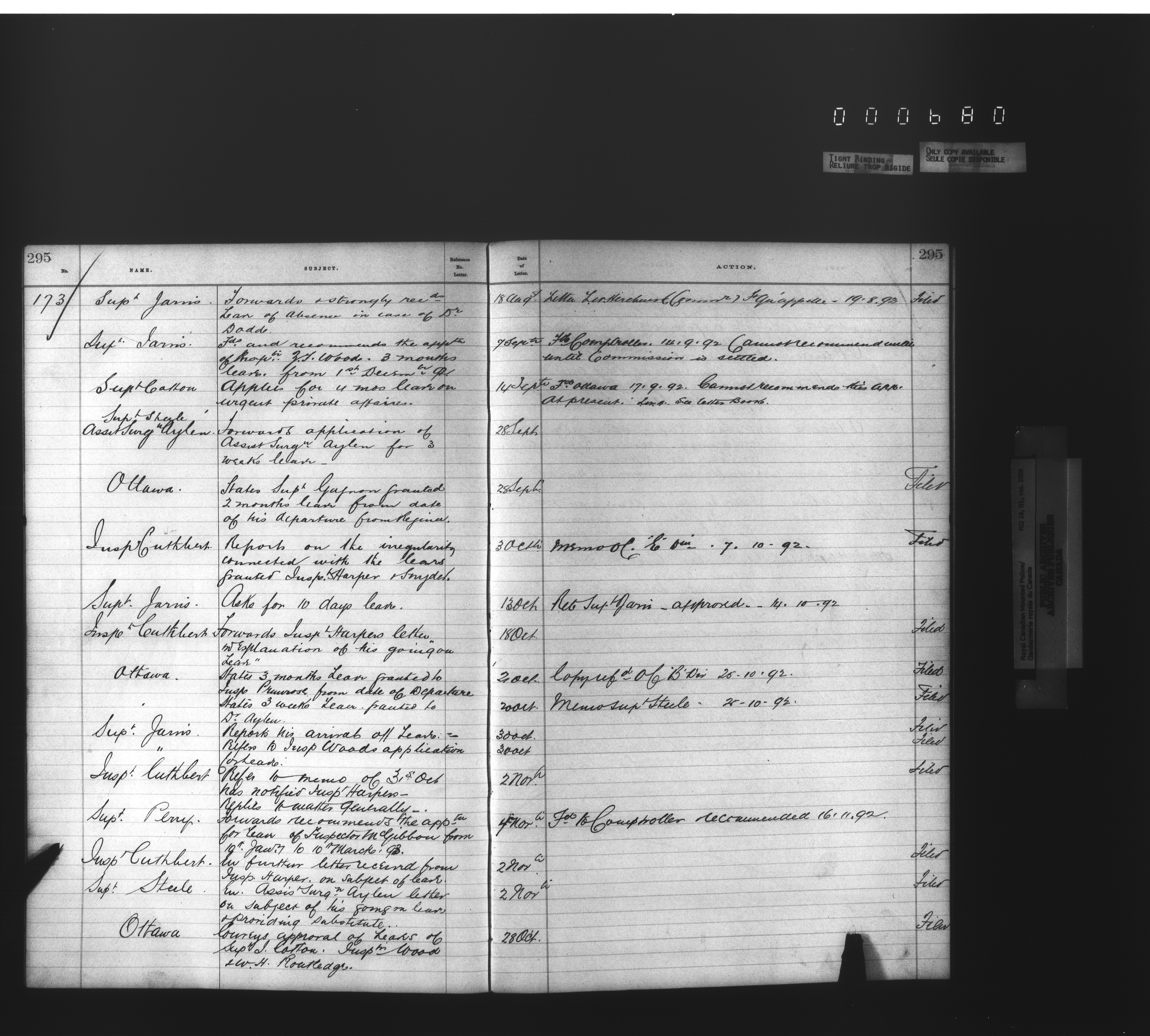 Royal Canadian Mounted Police, Office of the Commissioner: official correspondence: indexes and registers, 1876-1920 - 4480