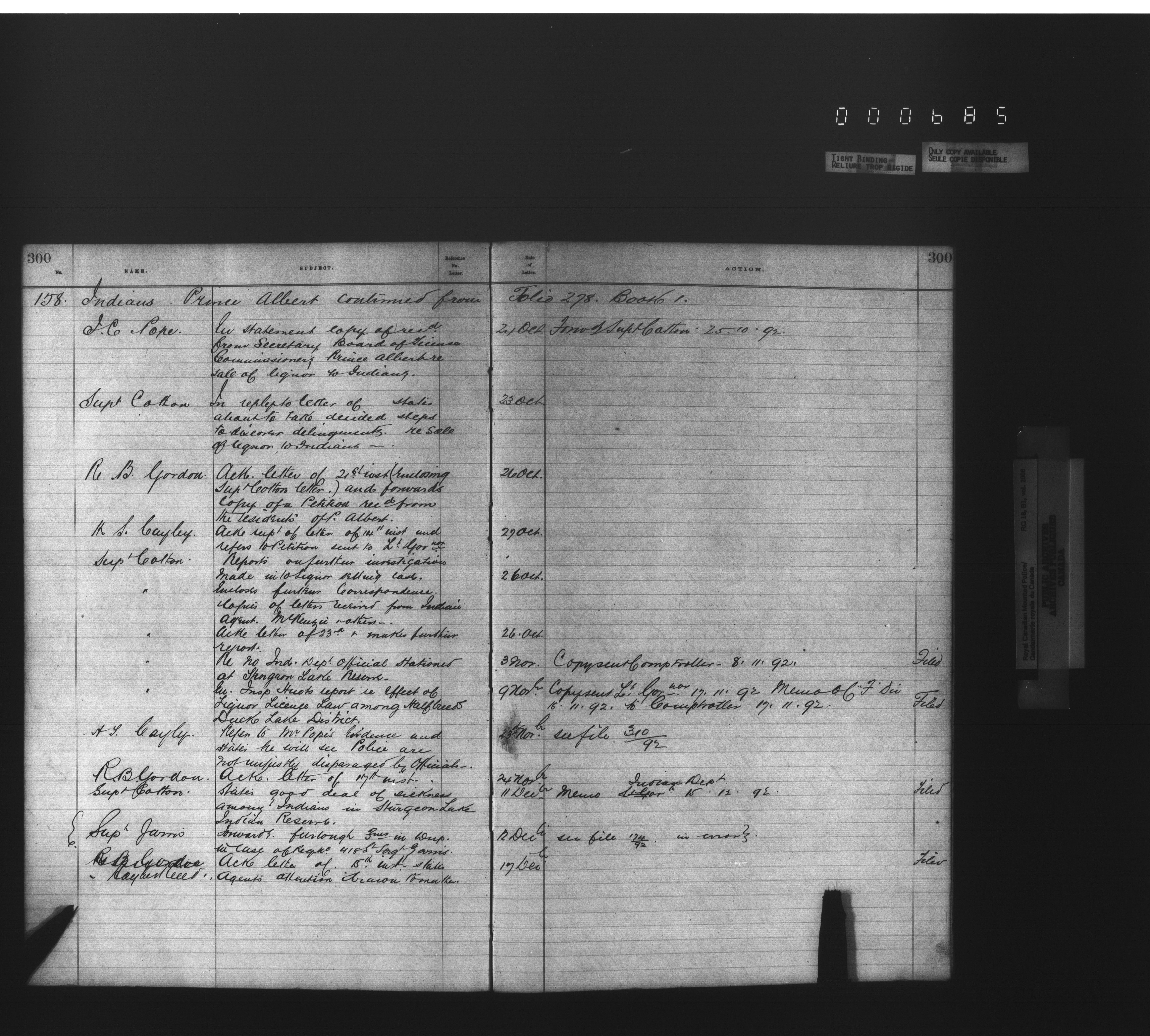 Royal Canadian Mounted Police, Office of the Commissioner: official correspondence: indexes and registers, 1876-1920 : T-4480