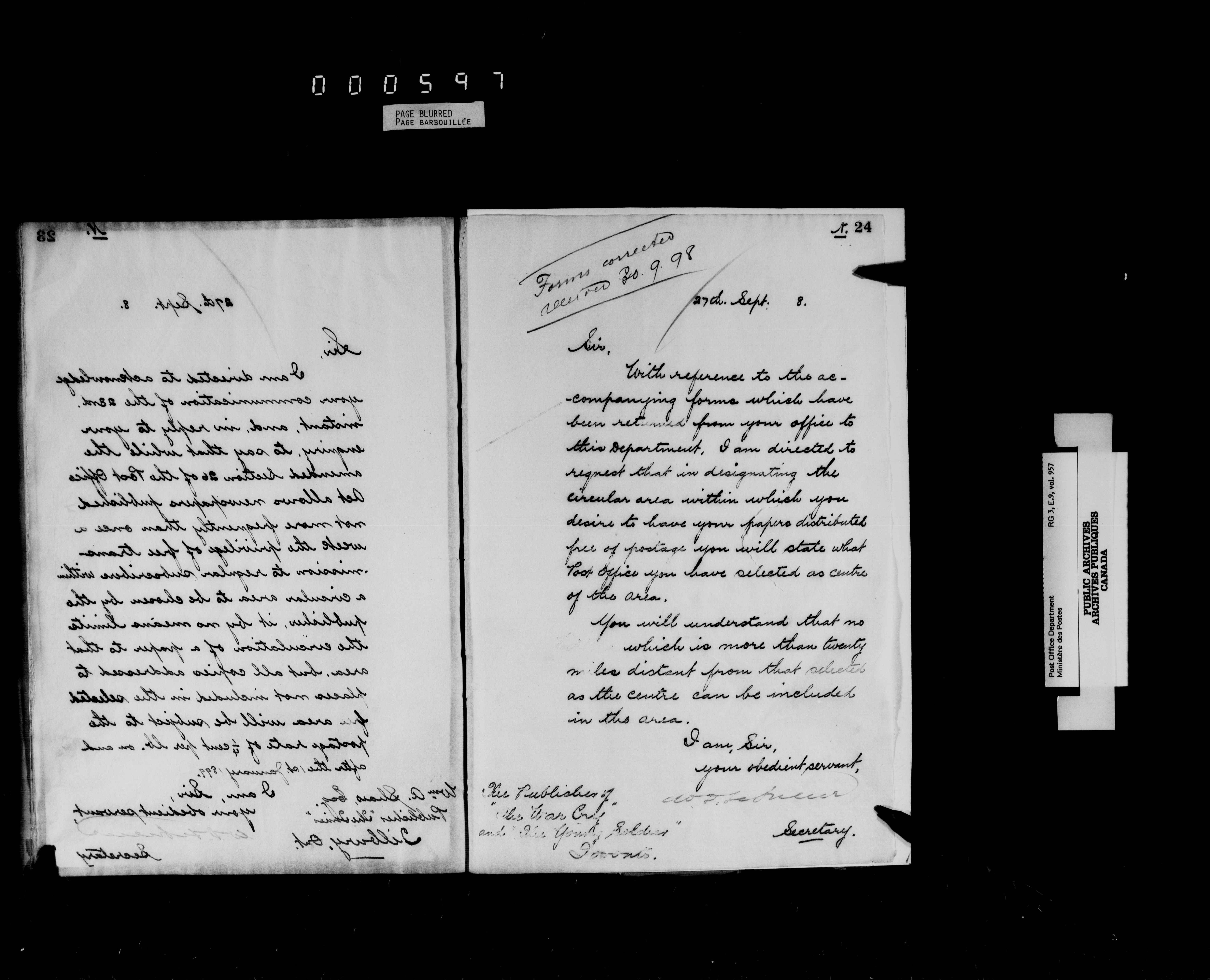 Post Office Department, Transportation Branch : Correspondence related to mail privileges and government patronage - 4597