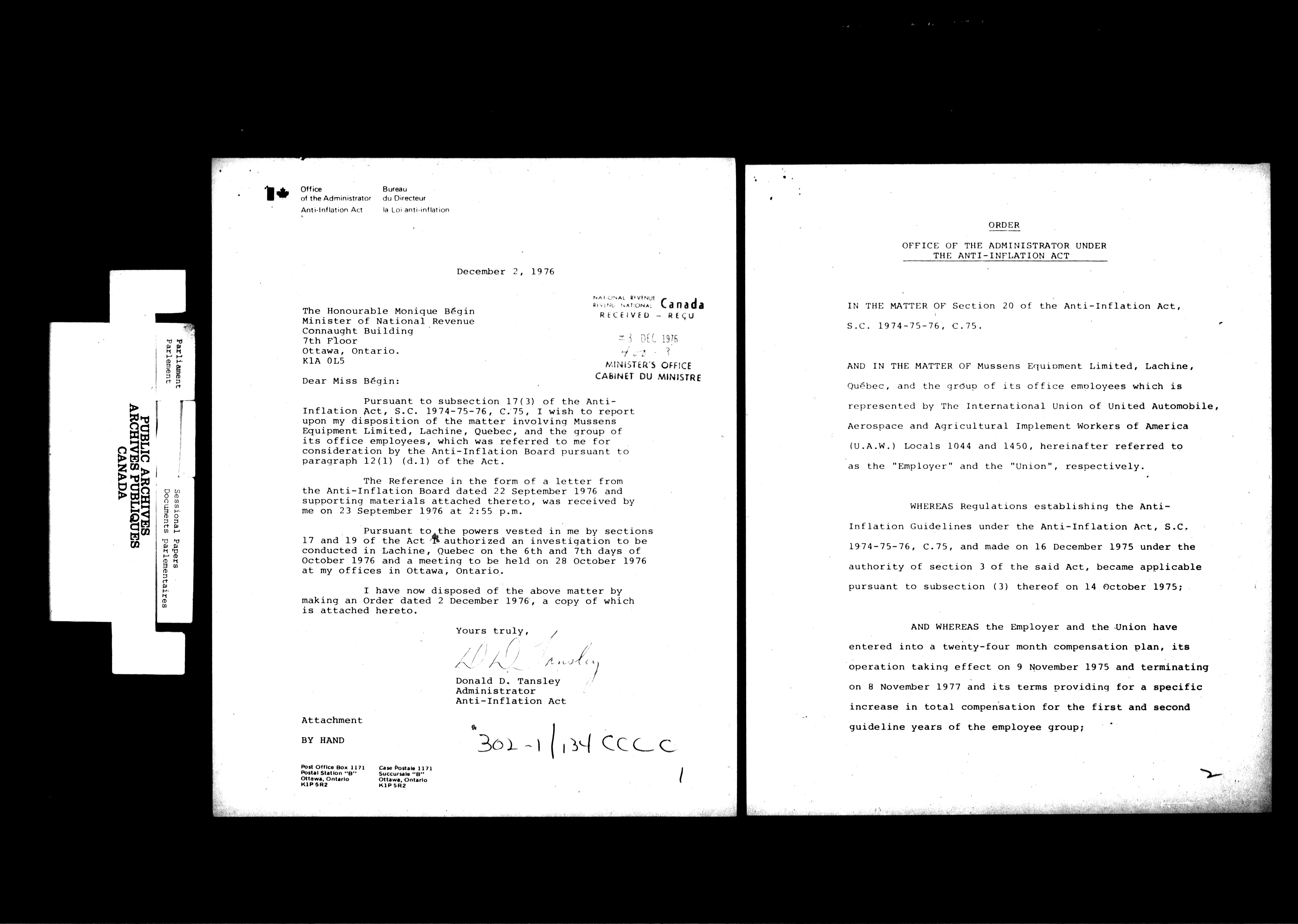 Unpublished sessional papers, 2nd Session, 30th Parliament - 4645