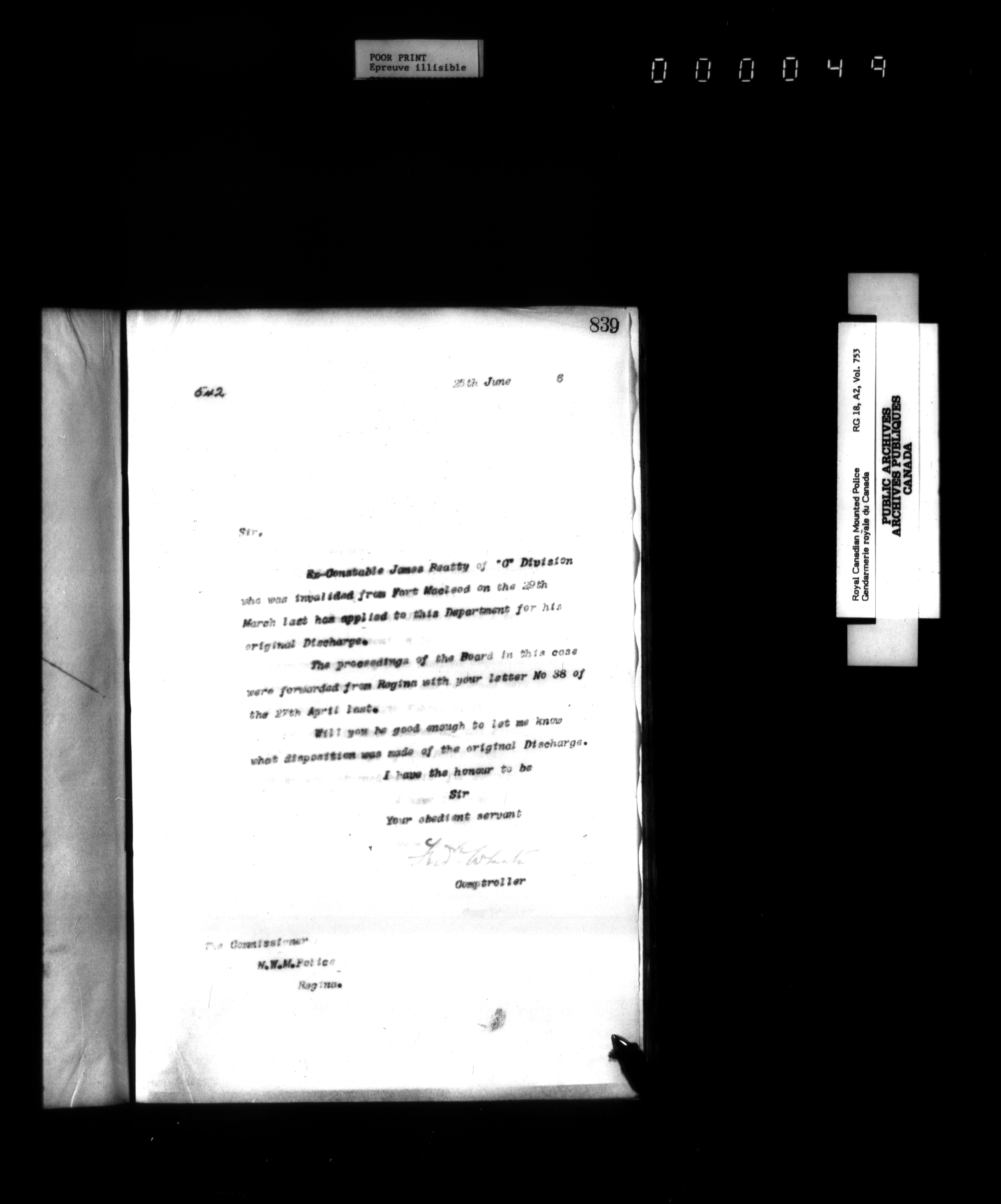 Royal Canadian Mounted Police, Office of the Comptroller : Letterbooks, 1883-1919 : T-4921