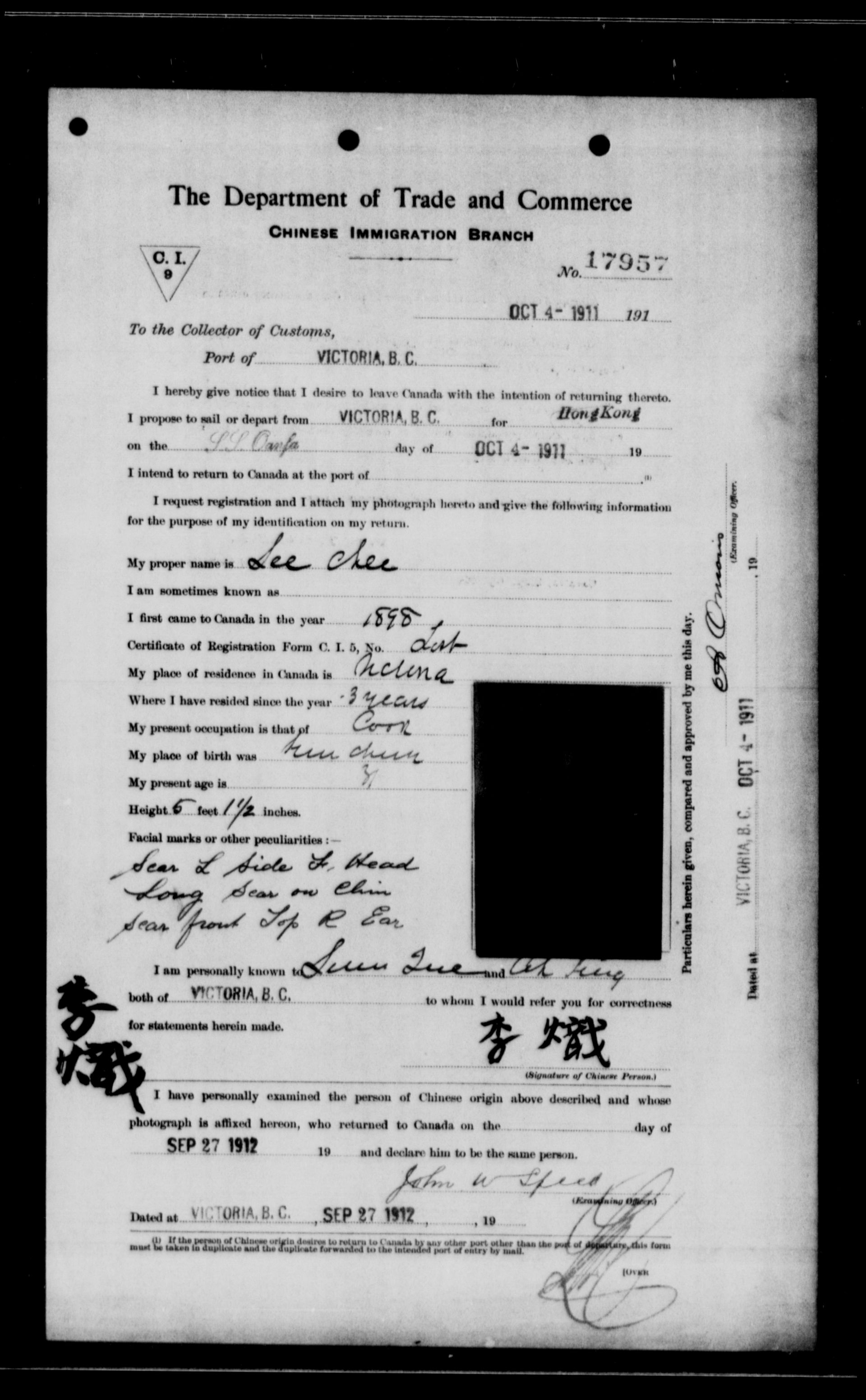 Chinese immigration records : C.I.9 certificates from Victoria : Sept. 1910-Oct. 1911 - 6038