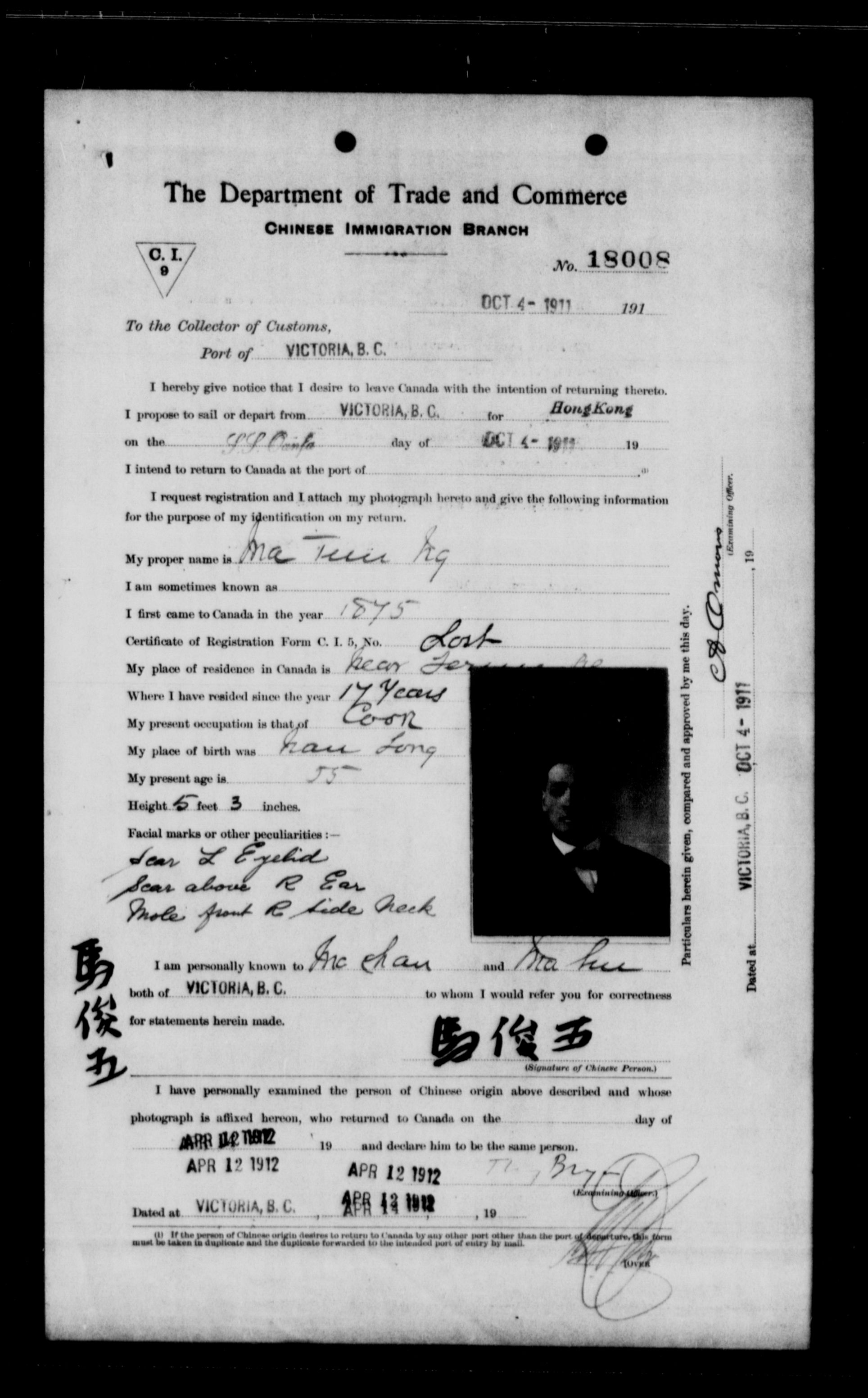 Chinese immigration records : C.I.9 certificates from Victoria : Sept. 1910-Oct. 1911 - 6038