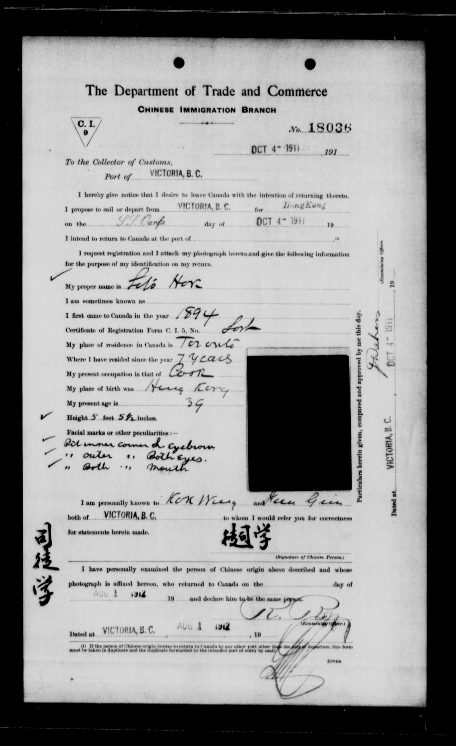 Chinese immigration records : C.I.9 certificates from Victoria : Sept. 1910-Oct. 1911 - 6038
