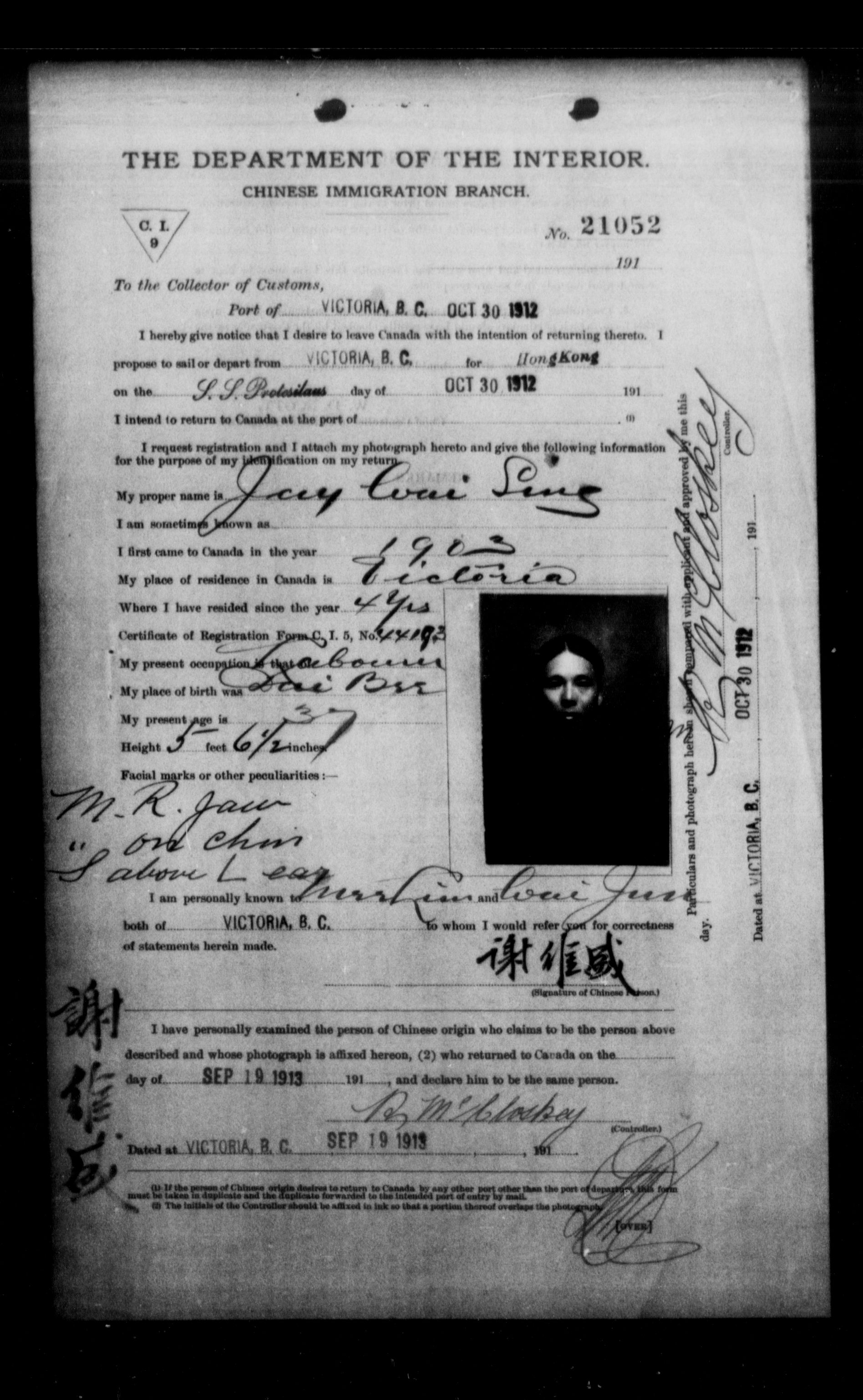Chinese immigration records : C.I.9 certificates from Vancouver and Victoria : T-6039