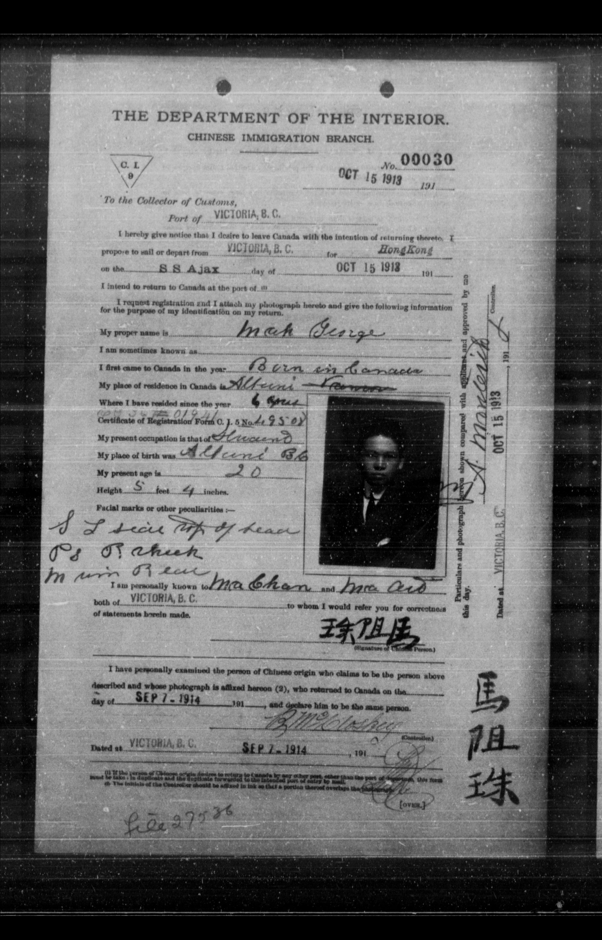 Chinese immigration records : C.I.9 certificates from Vancouver and Victoria : T-6046