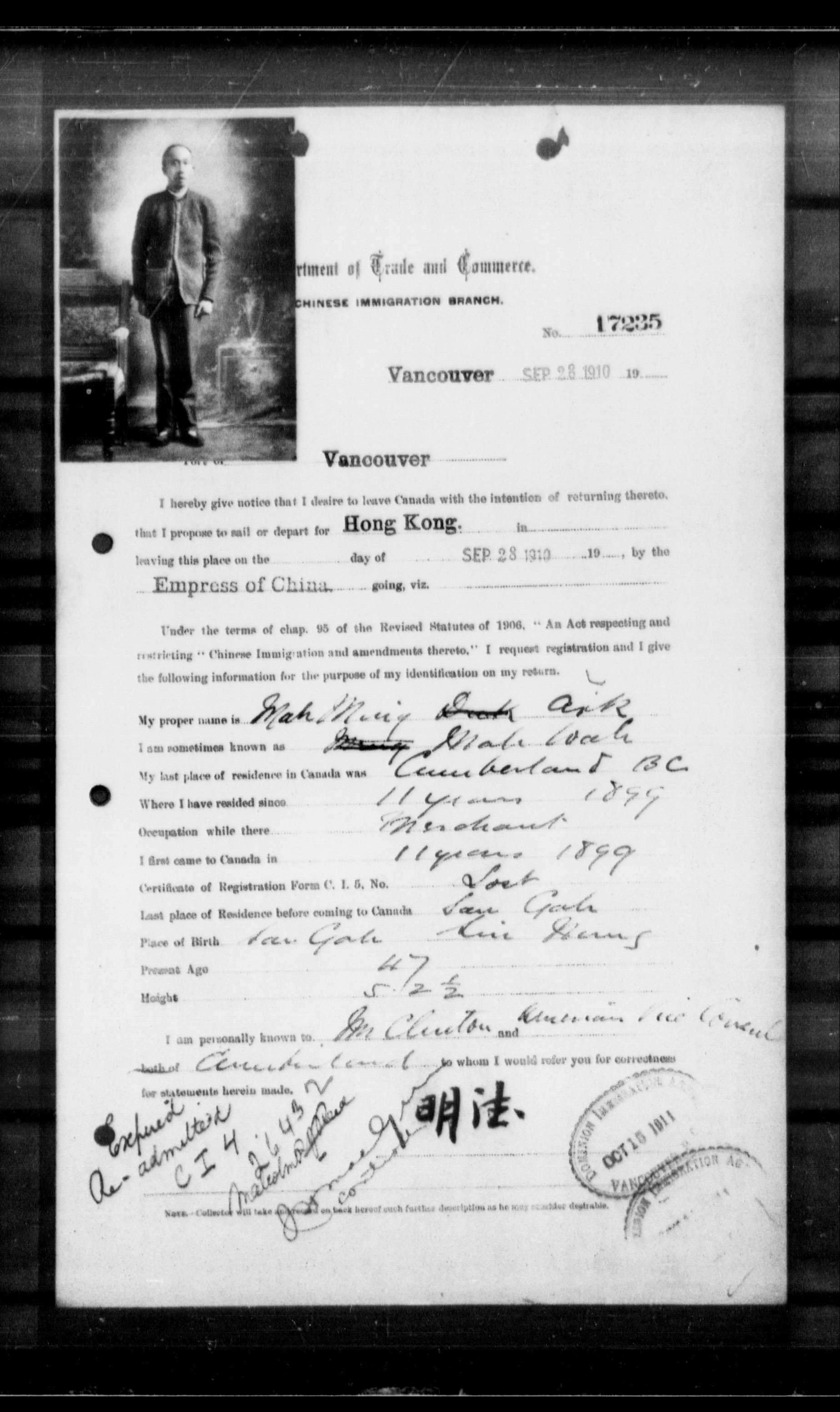 Chinese immigration records : C.I.9 certificates from Vancouver : Sept. 1910-Jan. 1912 - 6047