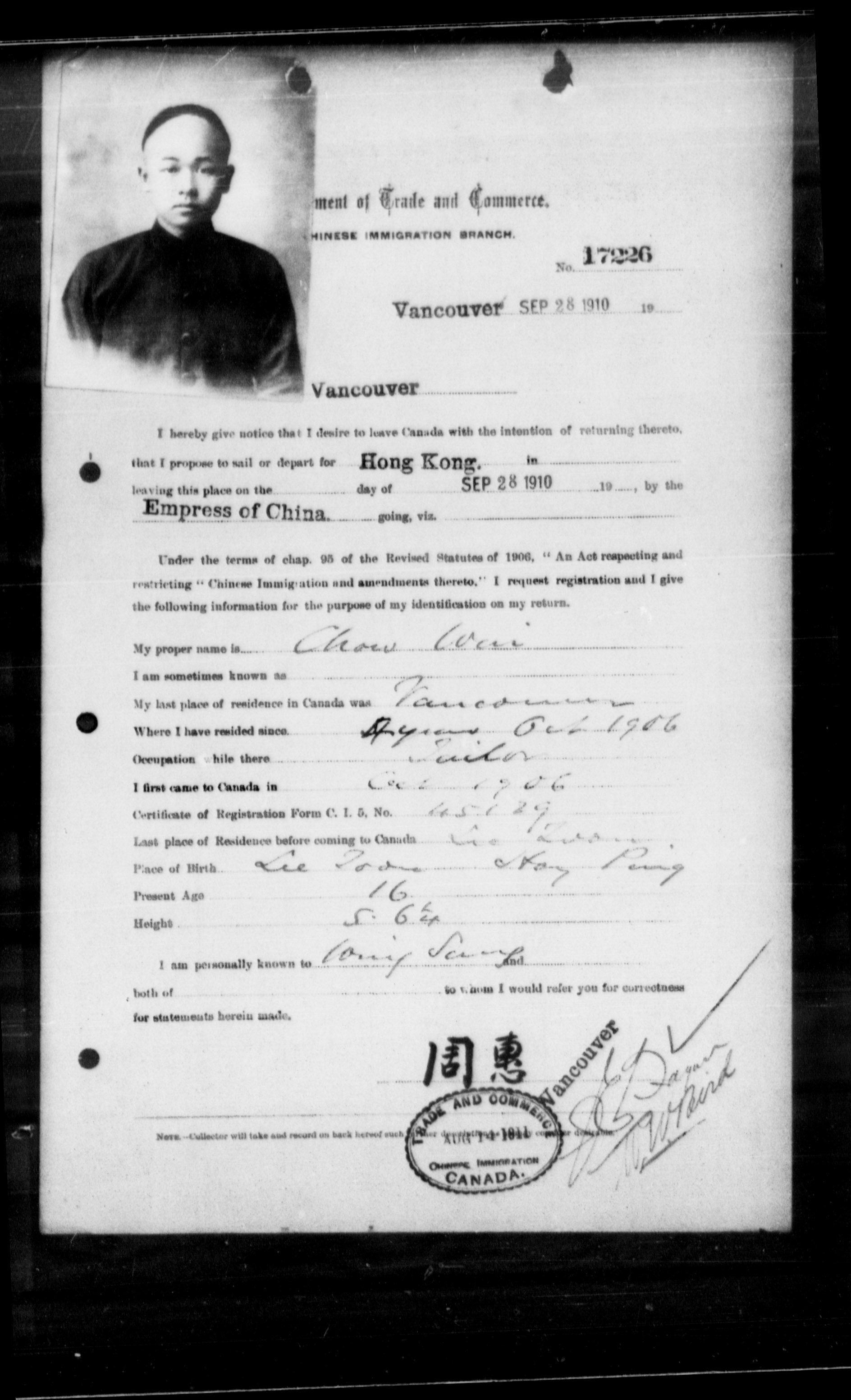 Chinese immigration records : C.I.9 certificates from Vancouver and Victoria : T-6047