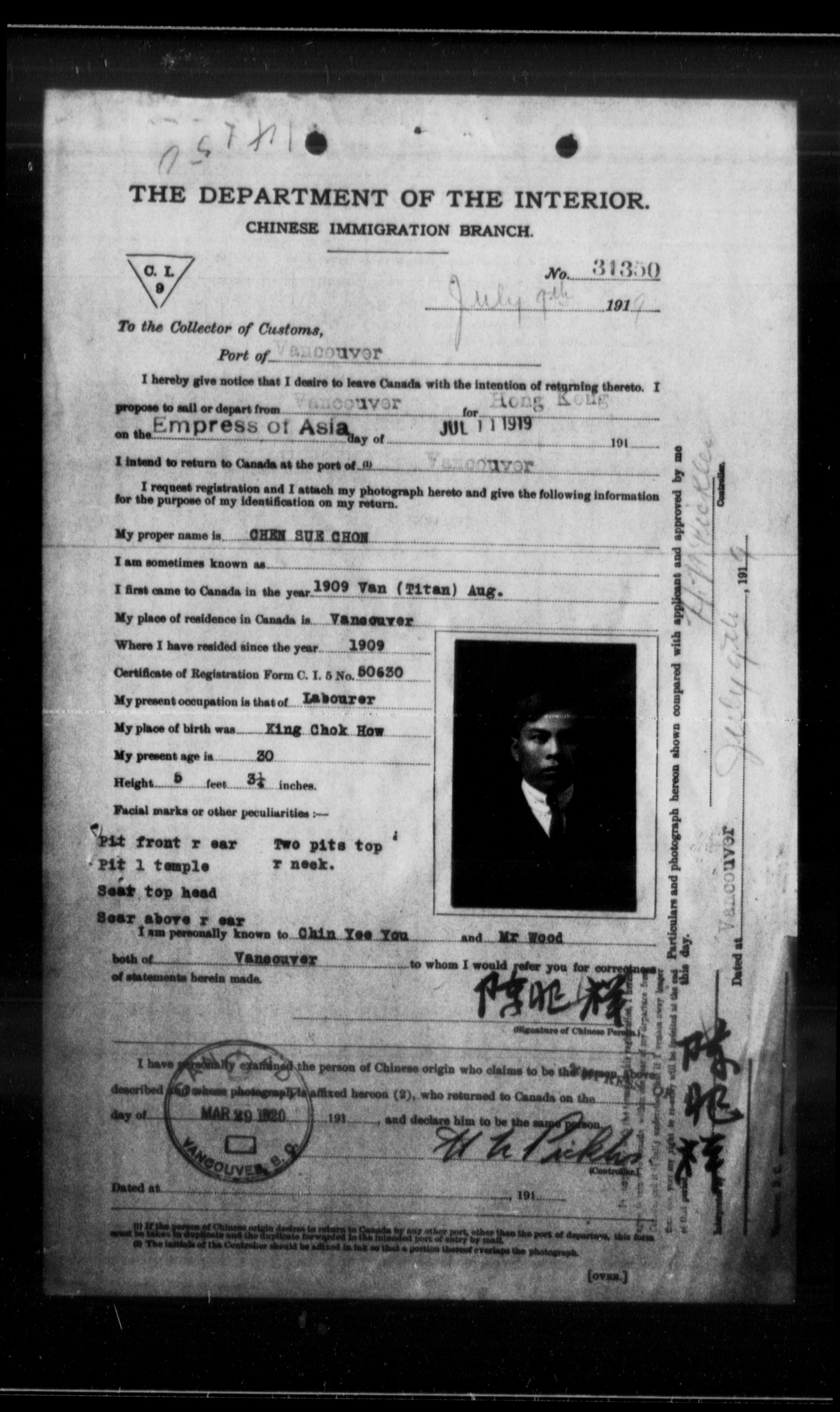 Chinese immigration records : C.I.9 certificates from Vancouver: Nov. 1917-July 1919 - 6051