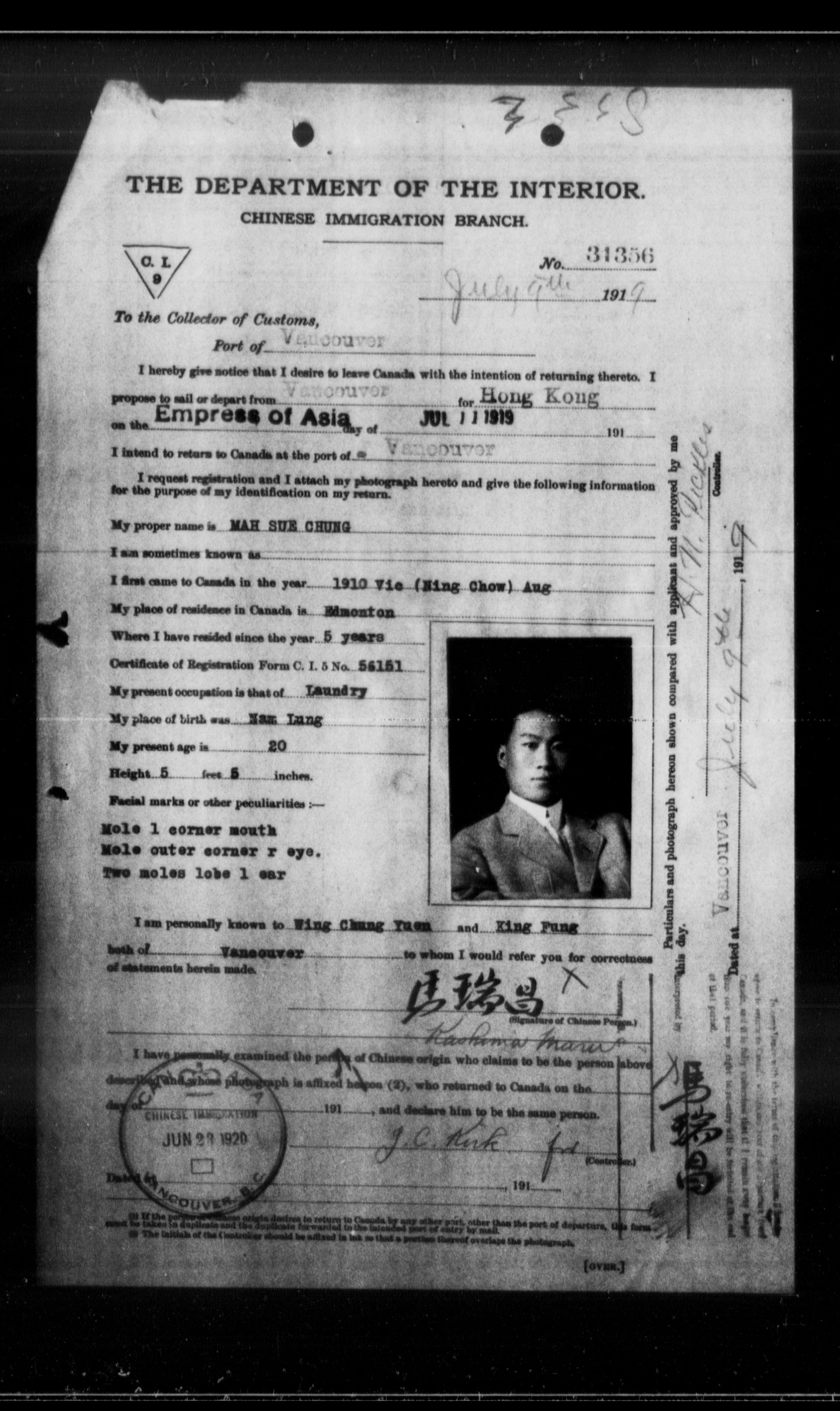 Chinese immigration records : C.I.9 certificates from Vancouver: Nov. 1917-July 1919 - 6051