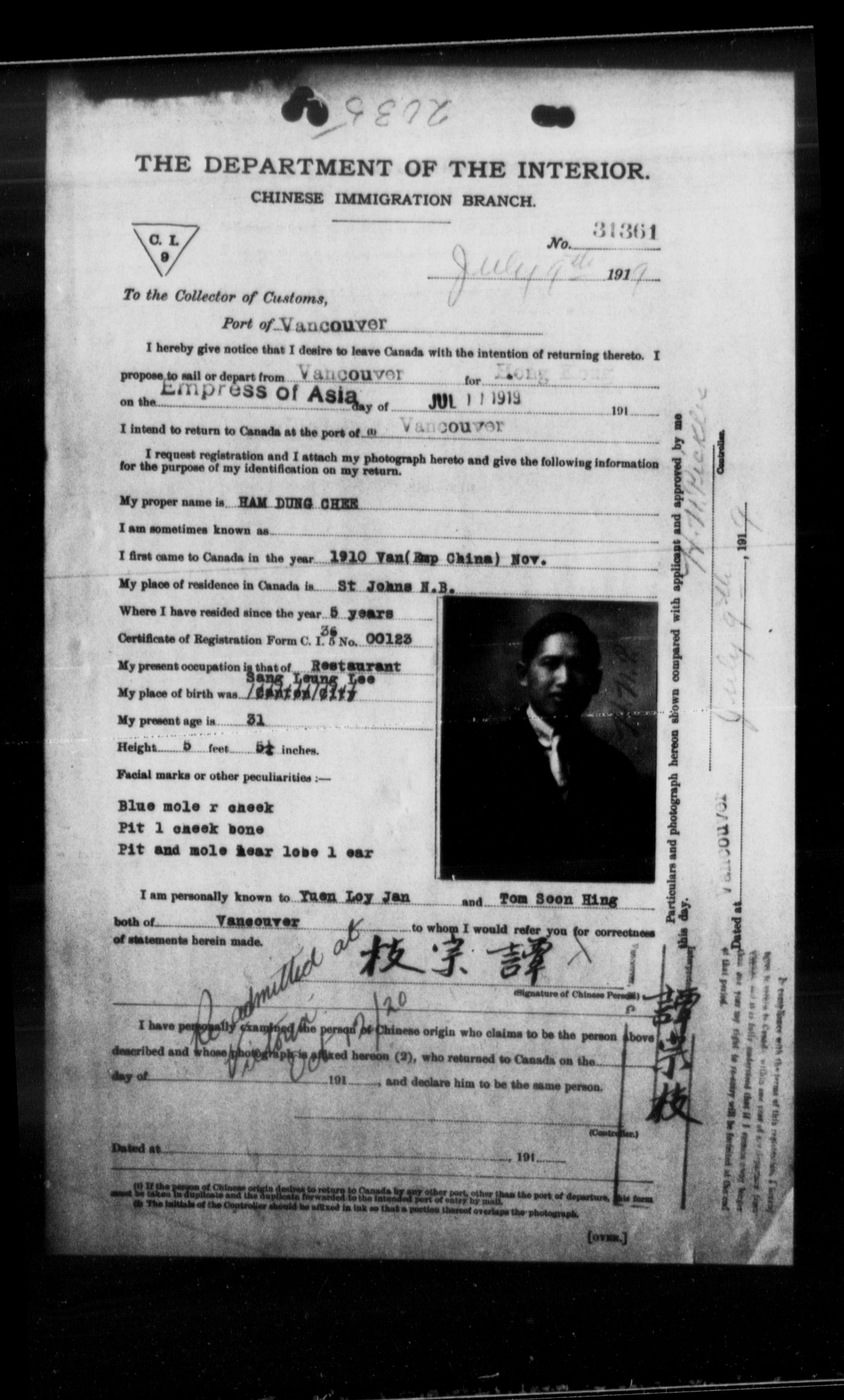 Chinese immigration records : C.I.9 certificates from Vancouver: Nov. 1917-July 1919 - 6051