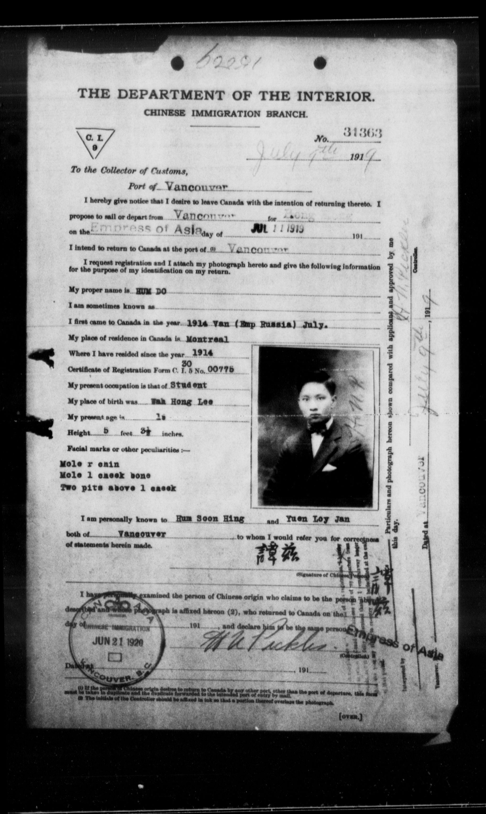 Chinese immigration records : C.I.9 certificates from Vancouver: Nov. 1917-July 1919 - 6051