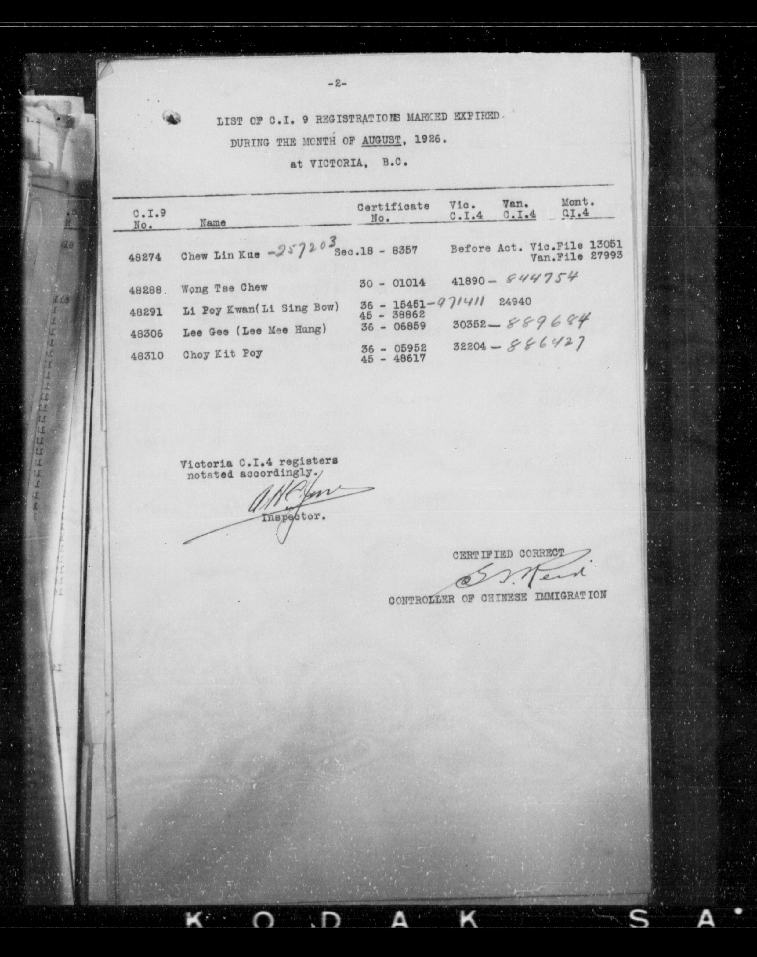 Chinese immigration records: Lists of persons readmitted to Canada at Victoria under C.I.9/9A certificates and other readmissions and cancellations - T-6055