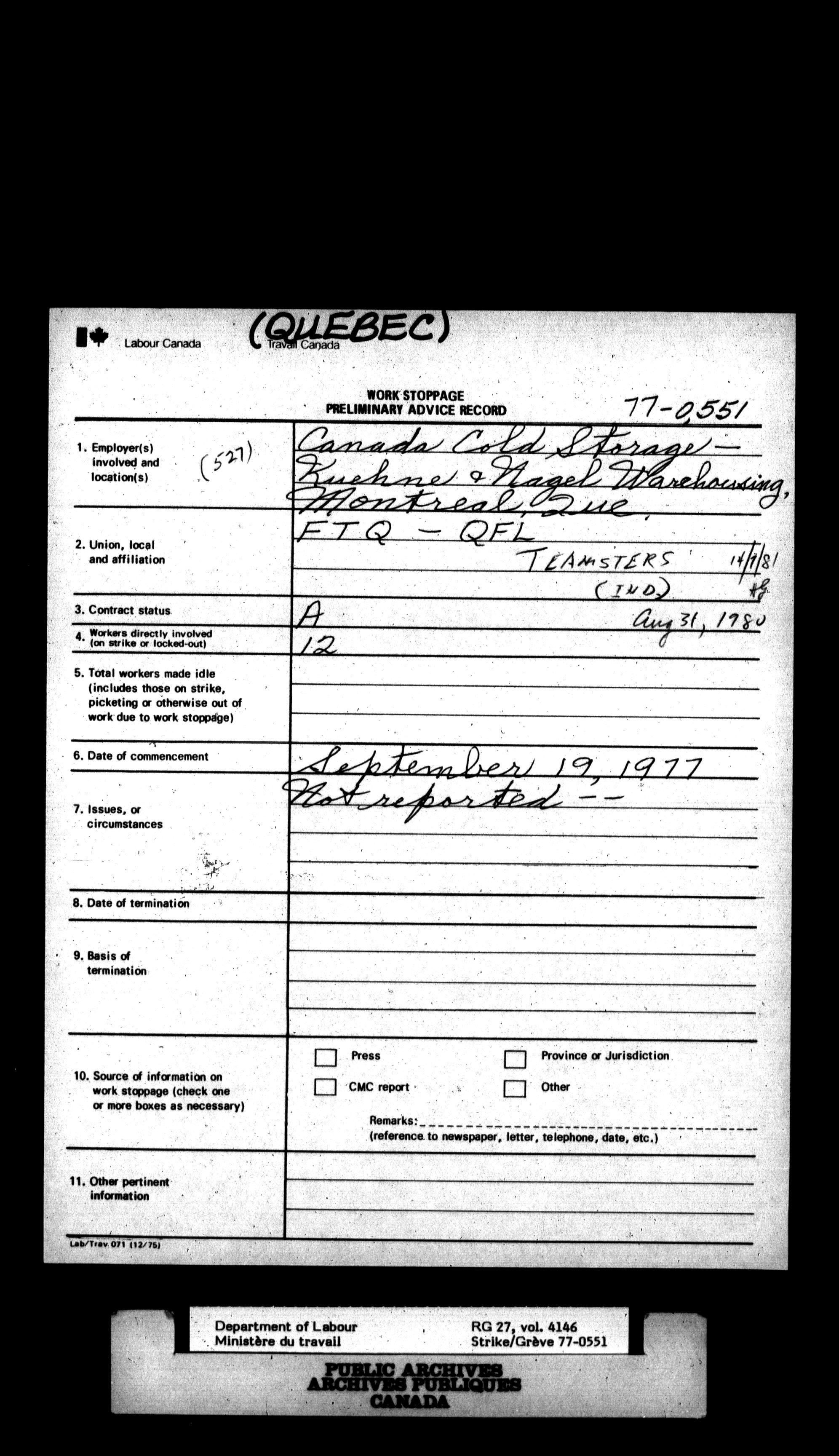Department of Labour, Economics and Research Branch : Strikes and lockout files : T-6174