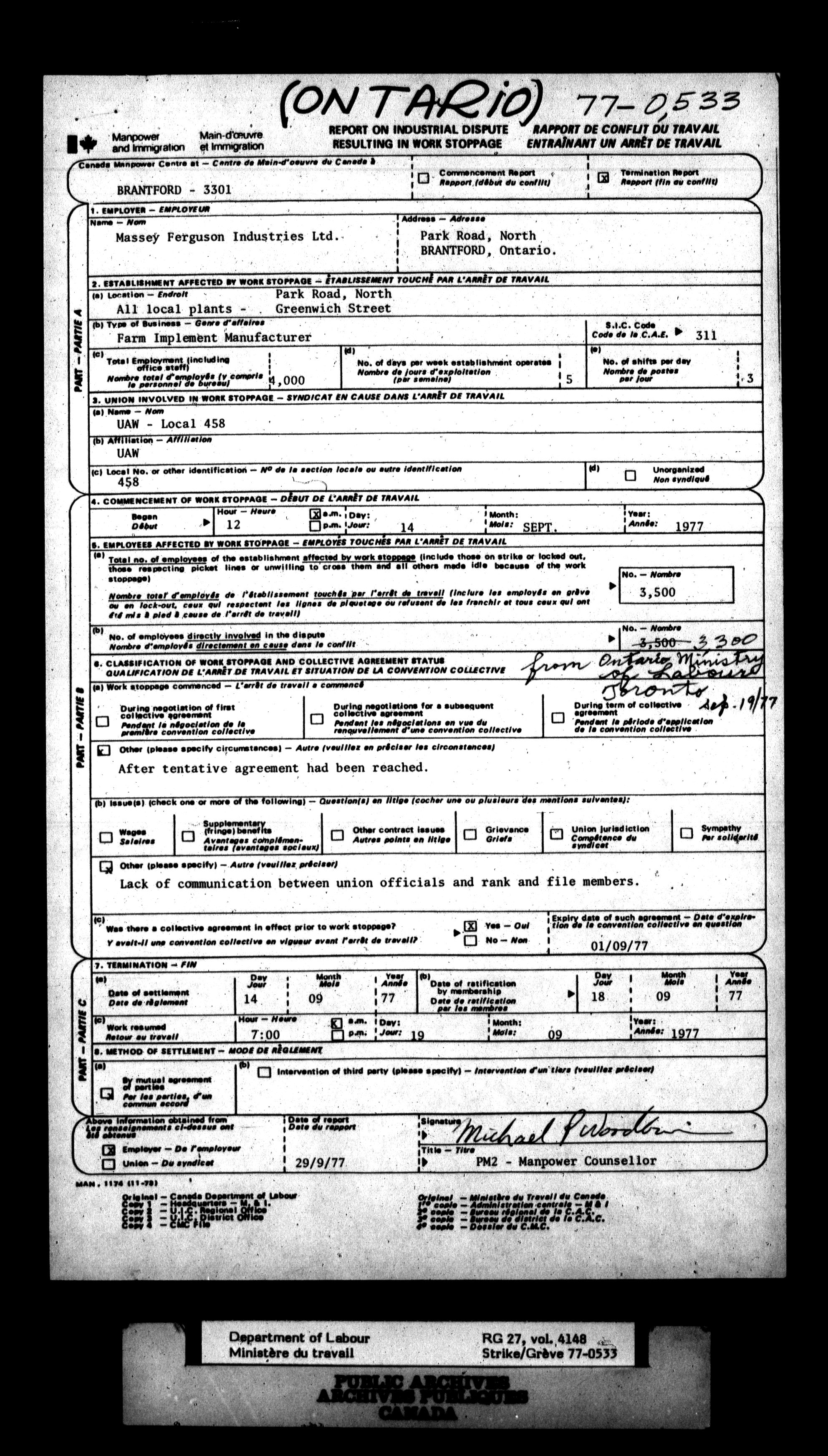 Department of Labour, Economics and Research Branch : Strikes and lockout files - 6175