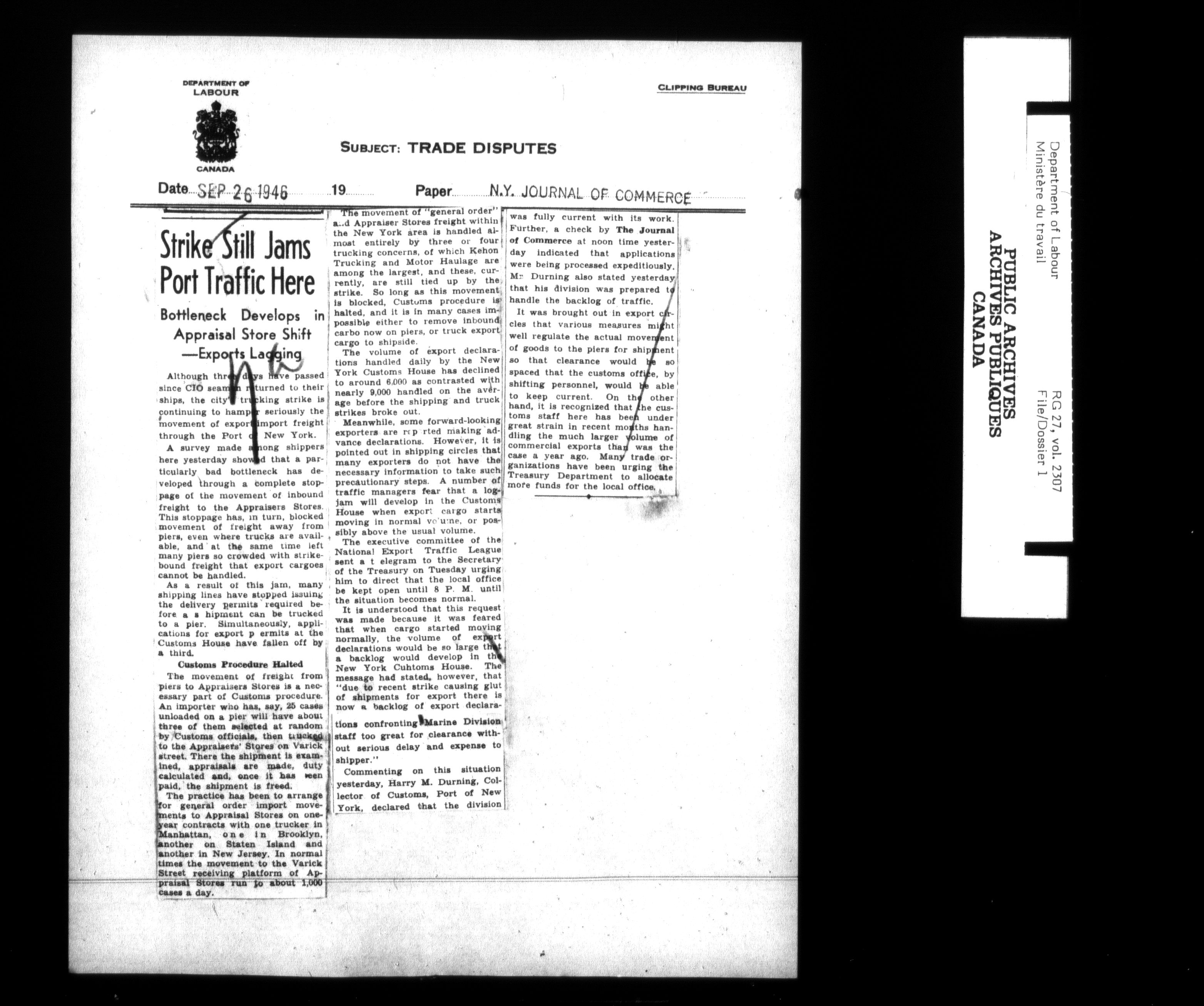 Department of Labour, Economics and Research Branch : Strikes and lockout files - 6201