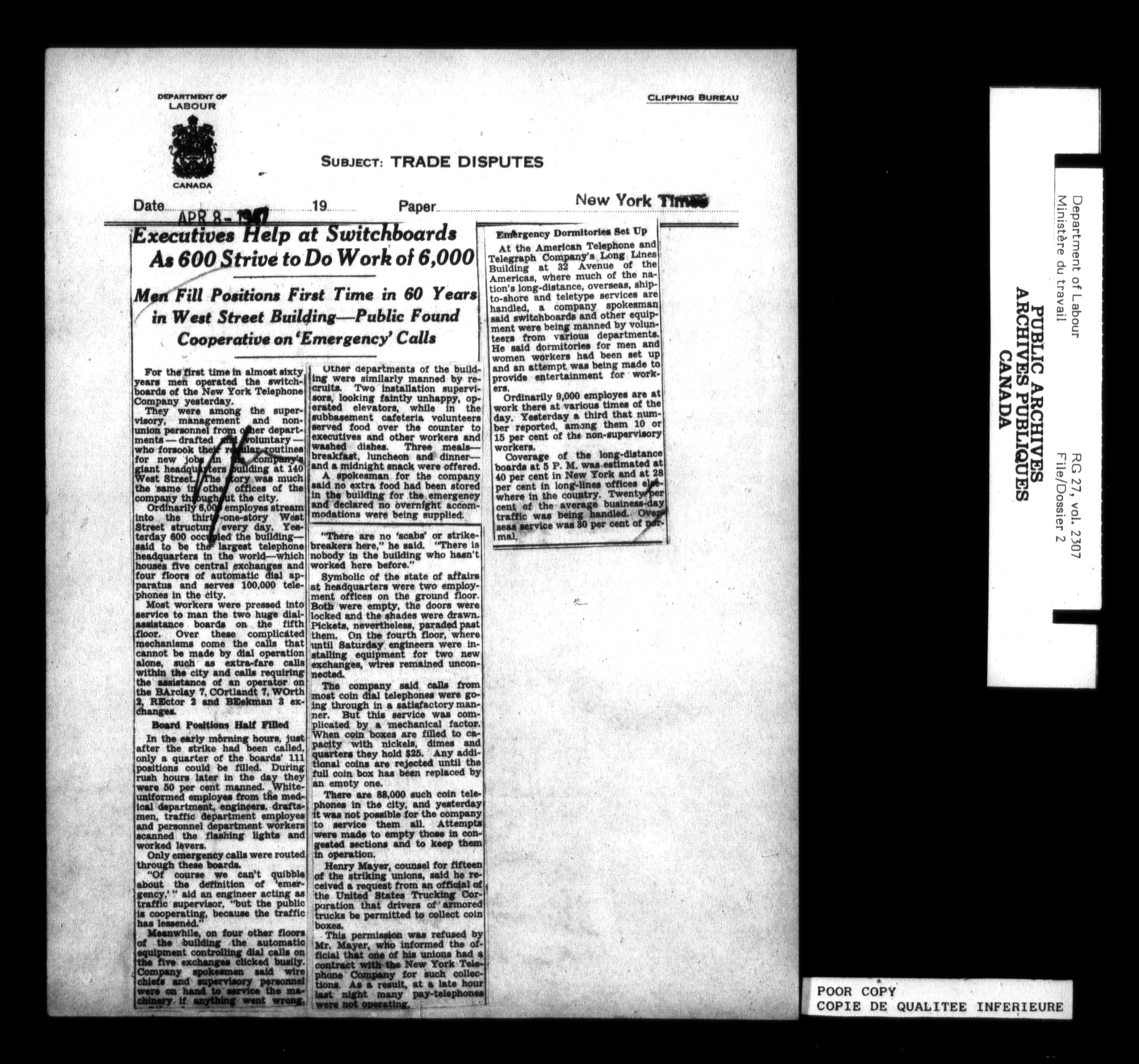 Department of Labour, Economics and Research Branch : Strikes and lockout files : T-6202
