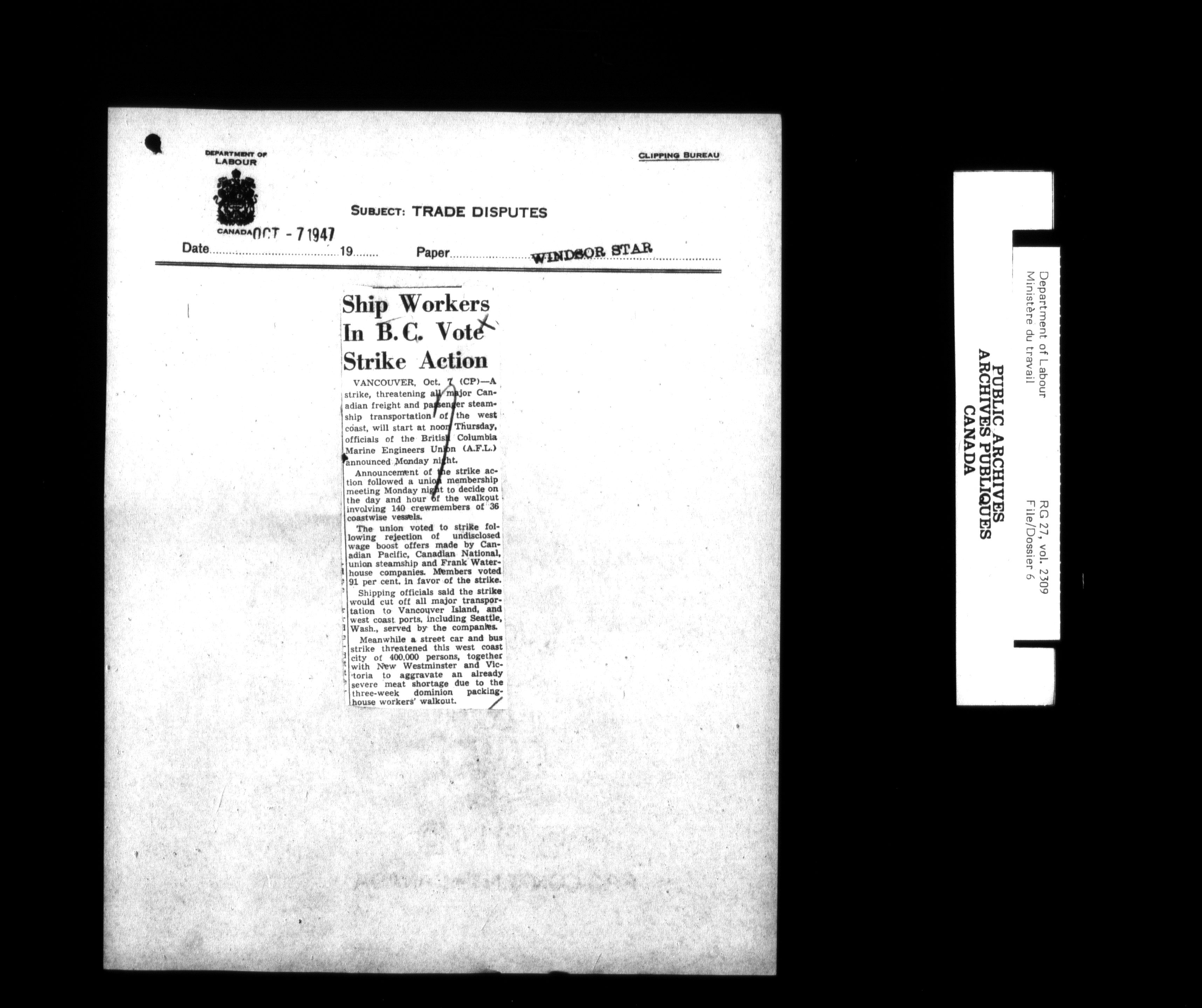 Department of Labour, Economics and Research Branch : Strikes and lockout files - 6203