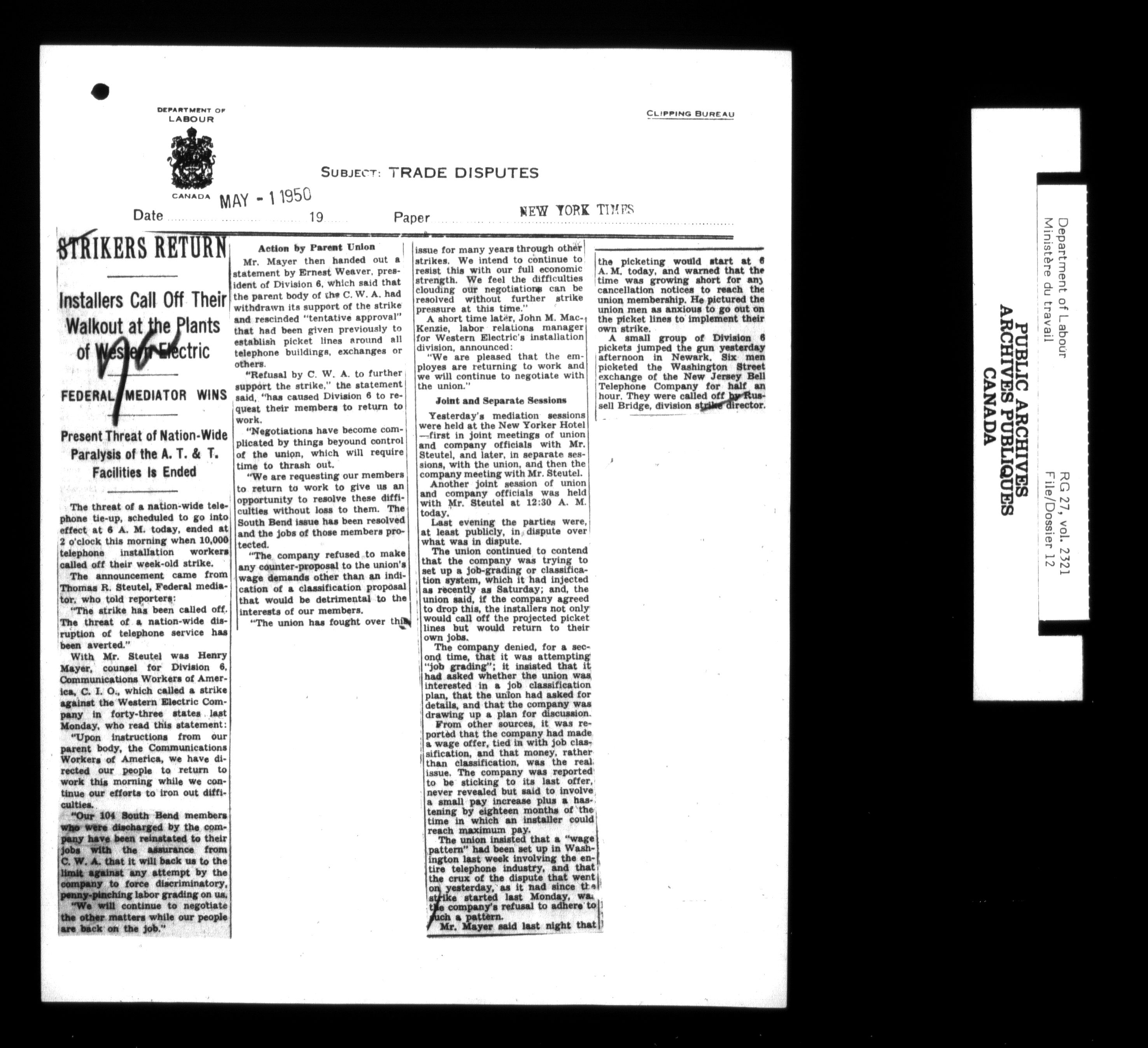 Department of Labour, Economics and Research Branch : Strikes and lockout files : T-6207