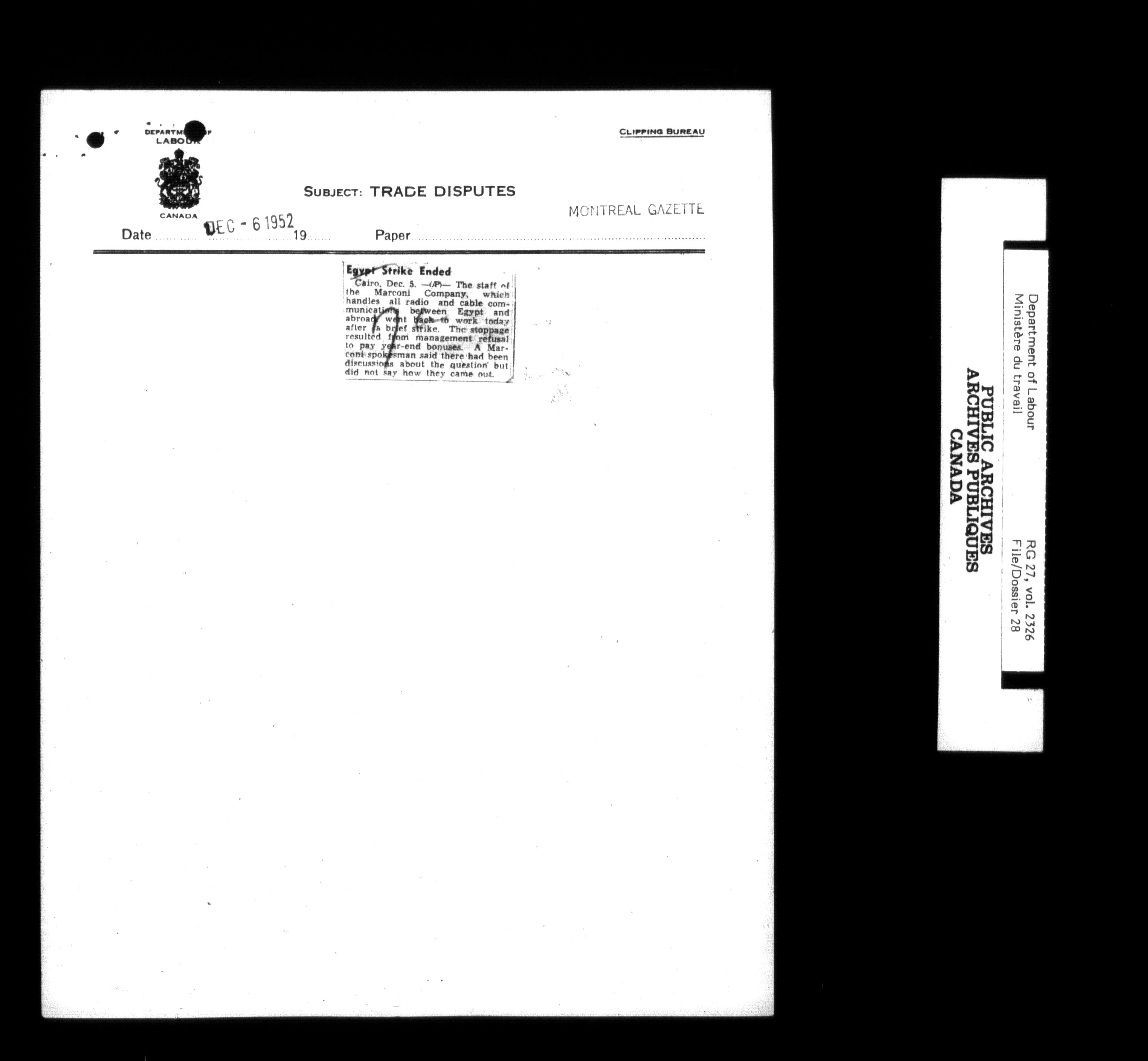 Department of Labour, Economics and Research Branch : Strikes and lockout files - 6210