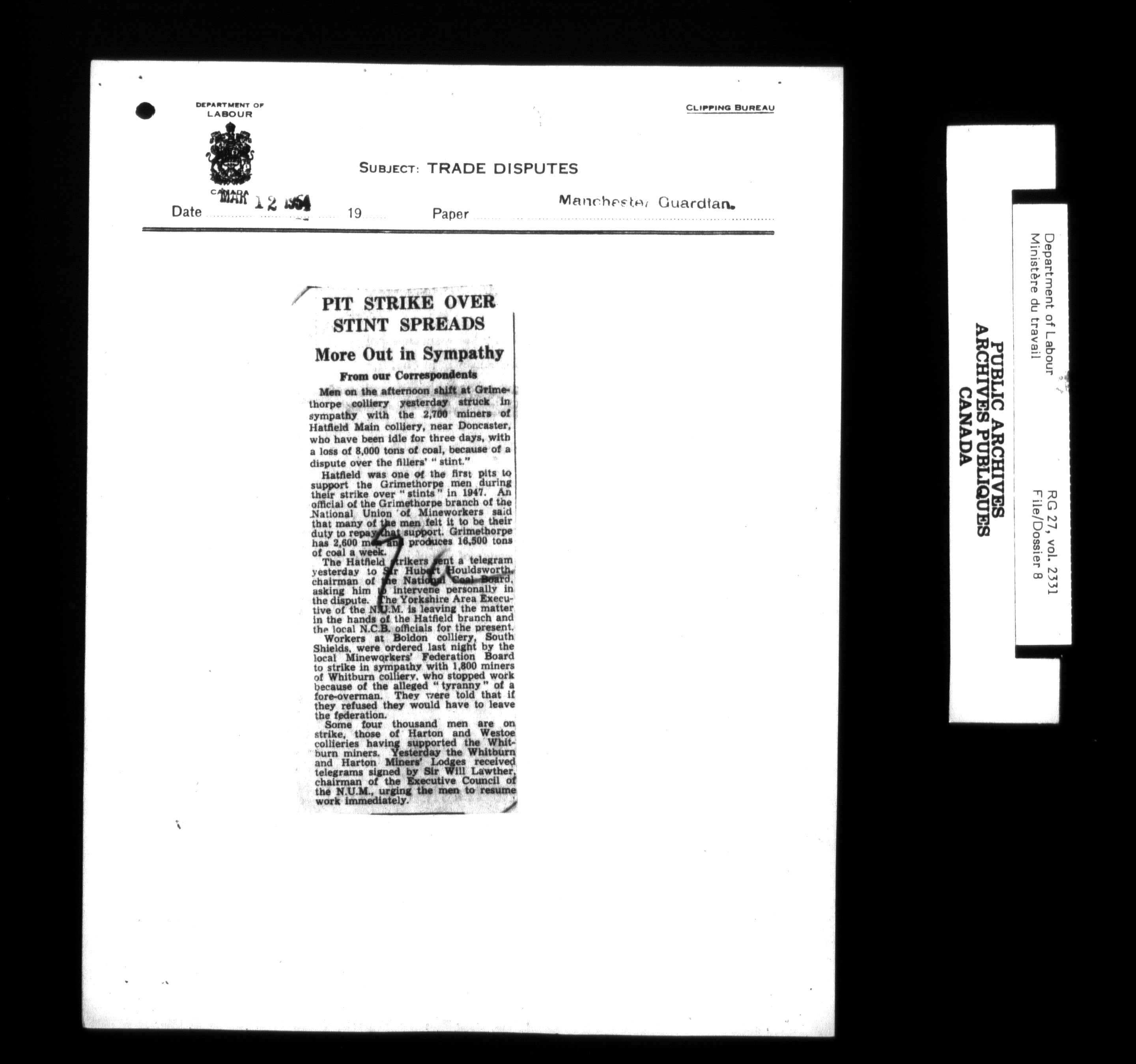Department of Labour, Economics and Research Branch : Strikes and lockout files - 6212
