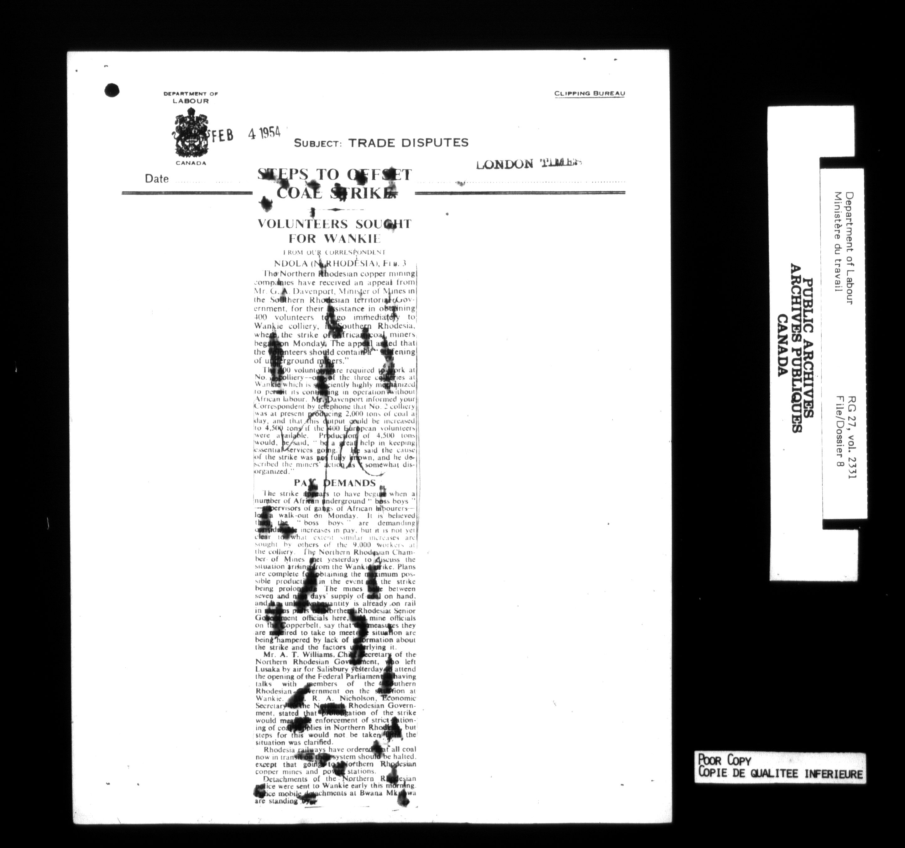 Department of Labour, Economics and Research Branch : Strikes and lockout files - 6212