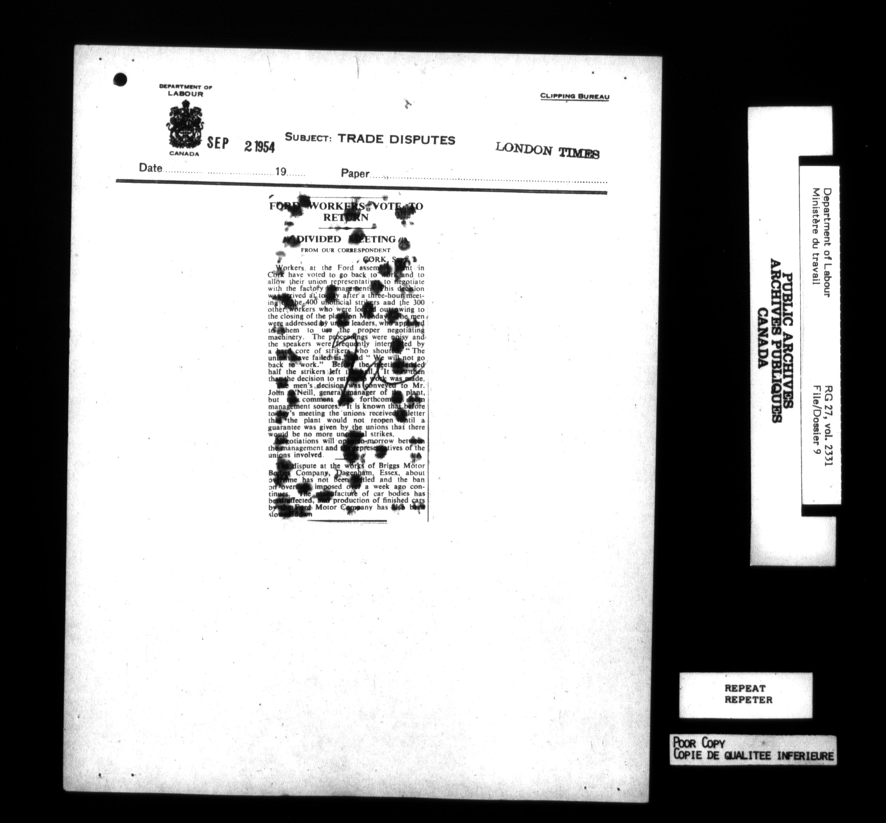 Department of Labour, Economics and Research Branch : Strikes and lockout files : T-6212