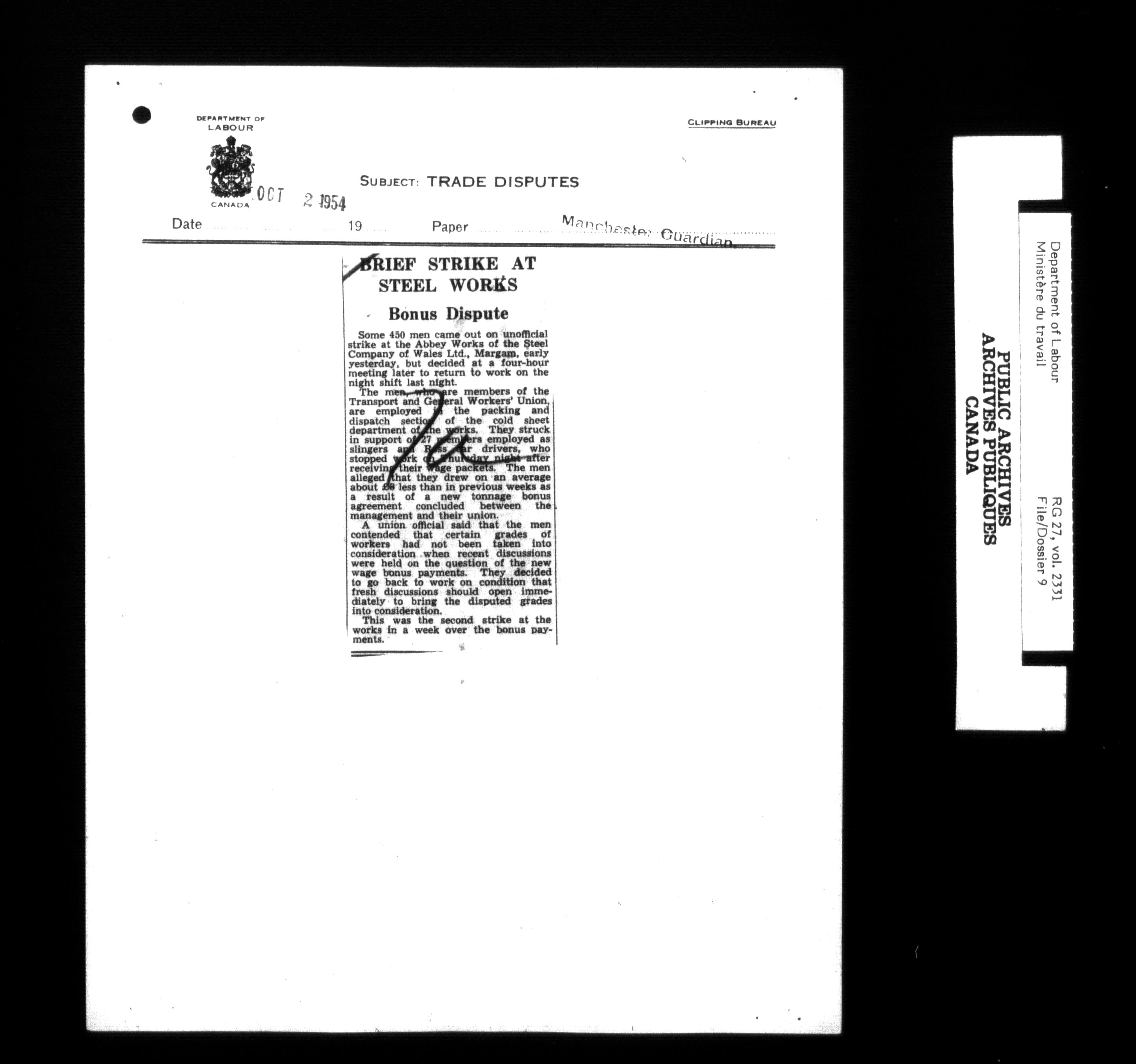 Department of Labour, Economics and Research Branch : Strikes and lockout files - 6212