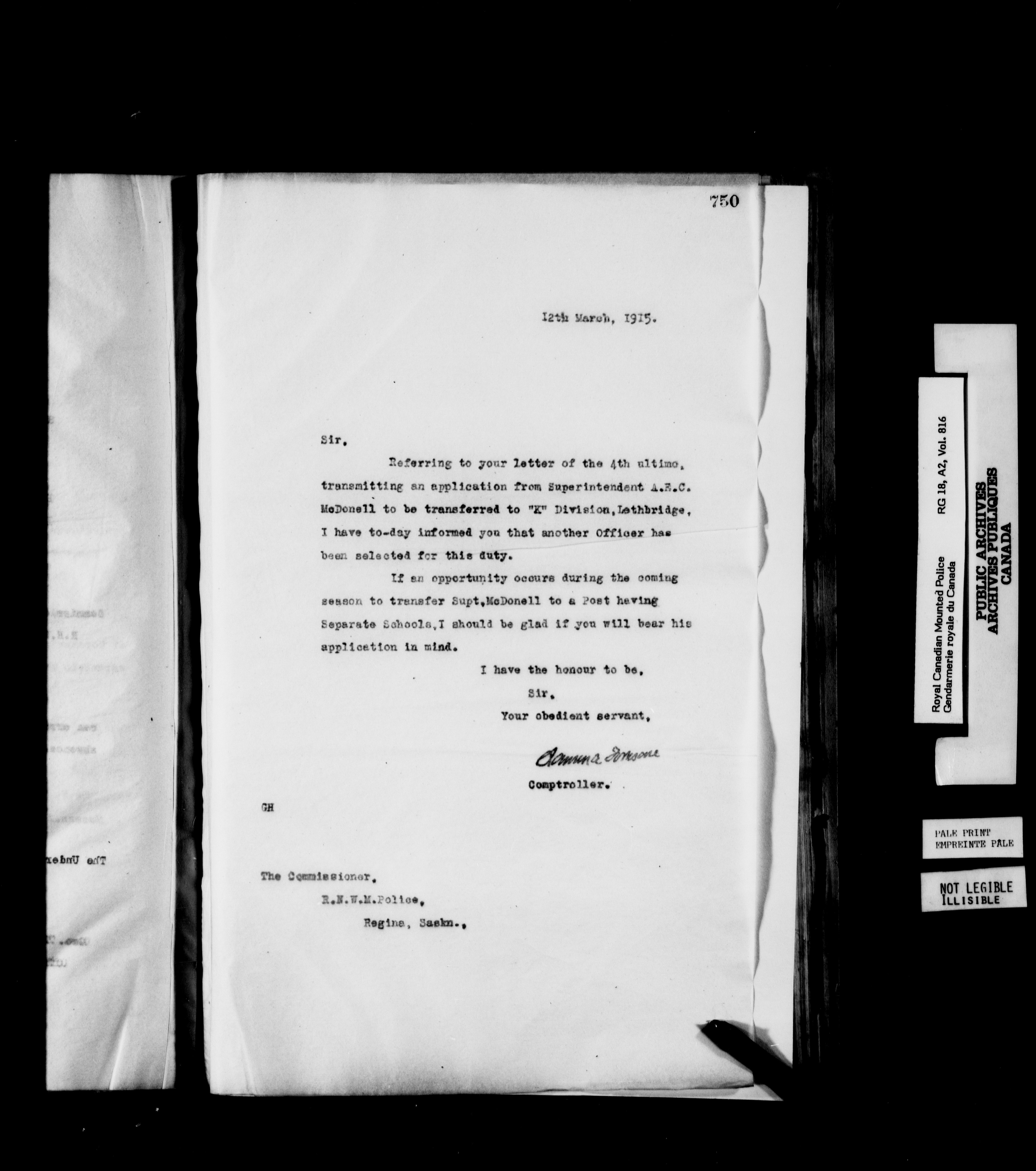 Royal Canadian Mounted Police, Office of the Comptroller : Letterbooks, 1883-1919 : T-6219