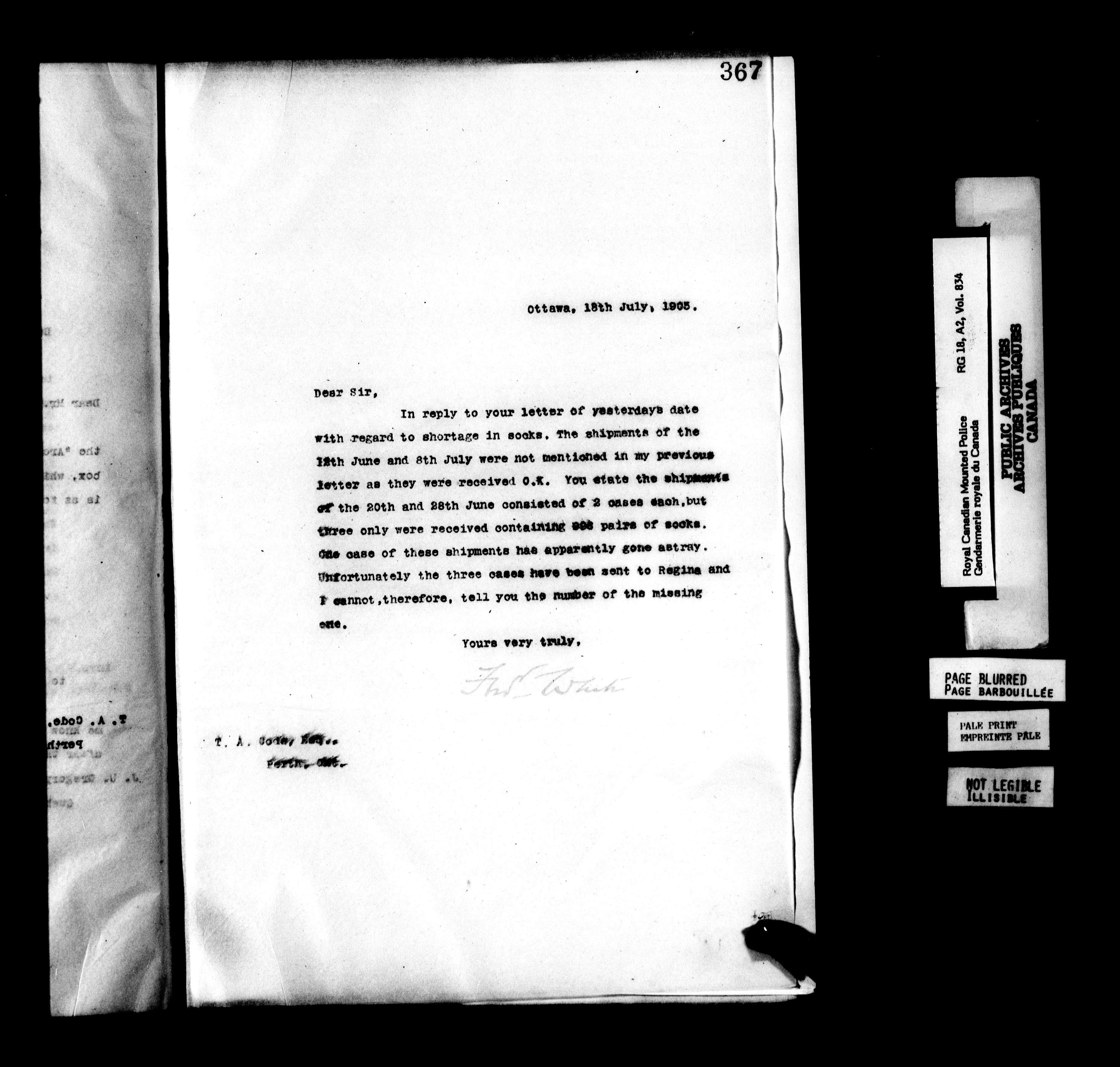 Royal Canadian Mounted Police, Office of the Comptroller : Semi-official correspondence, 1903-1919 - 6233