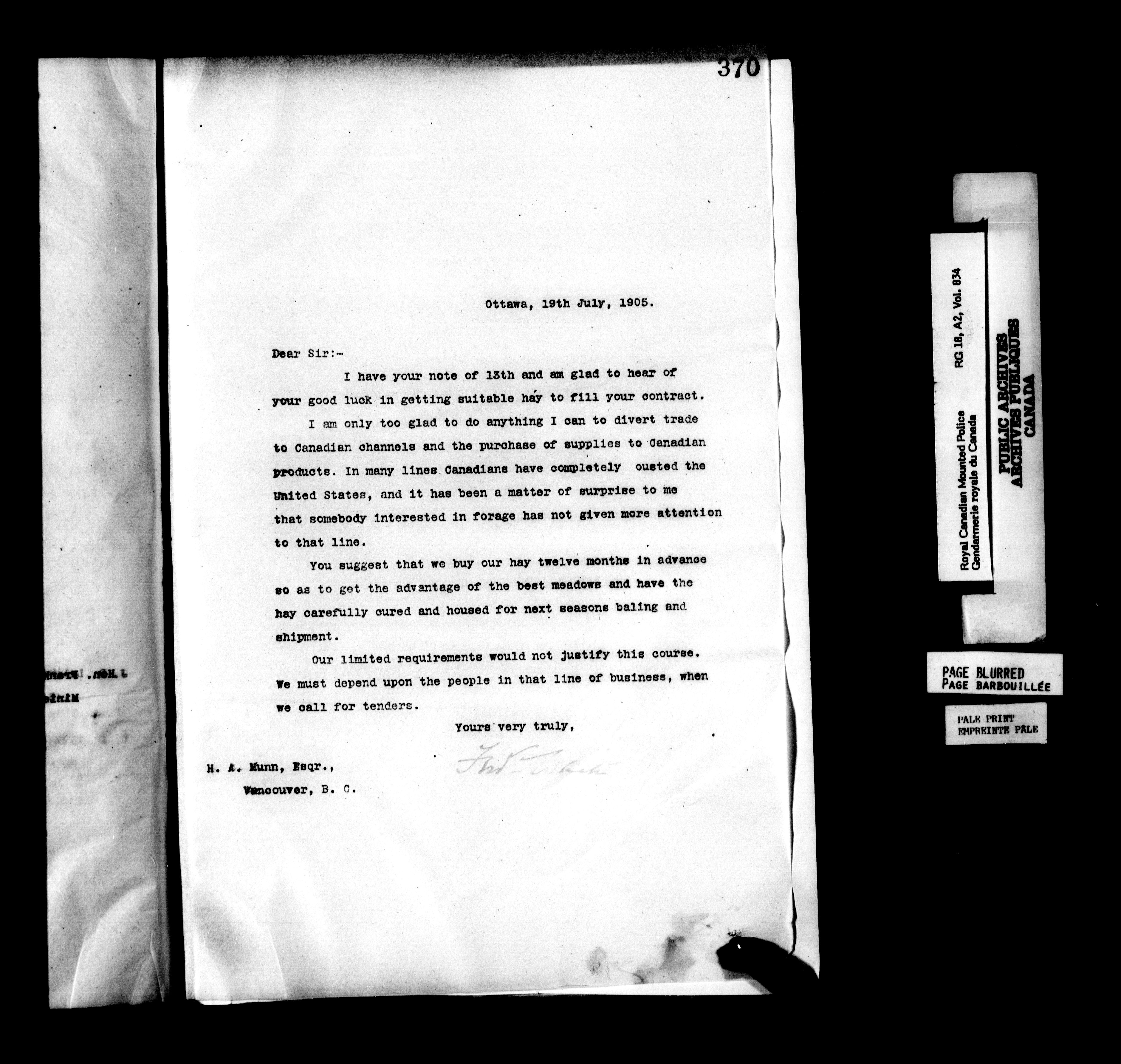 Royal Canadian Mounted Police, Office of the Comptroller : Semi-official correspondence, 1903-1919 - 6233