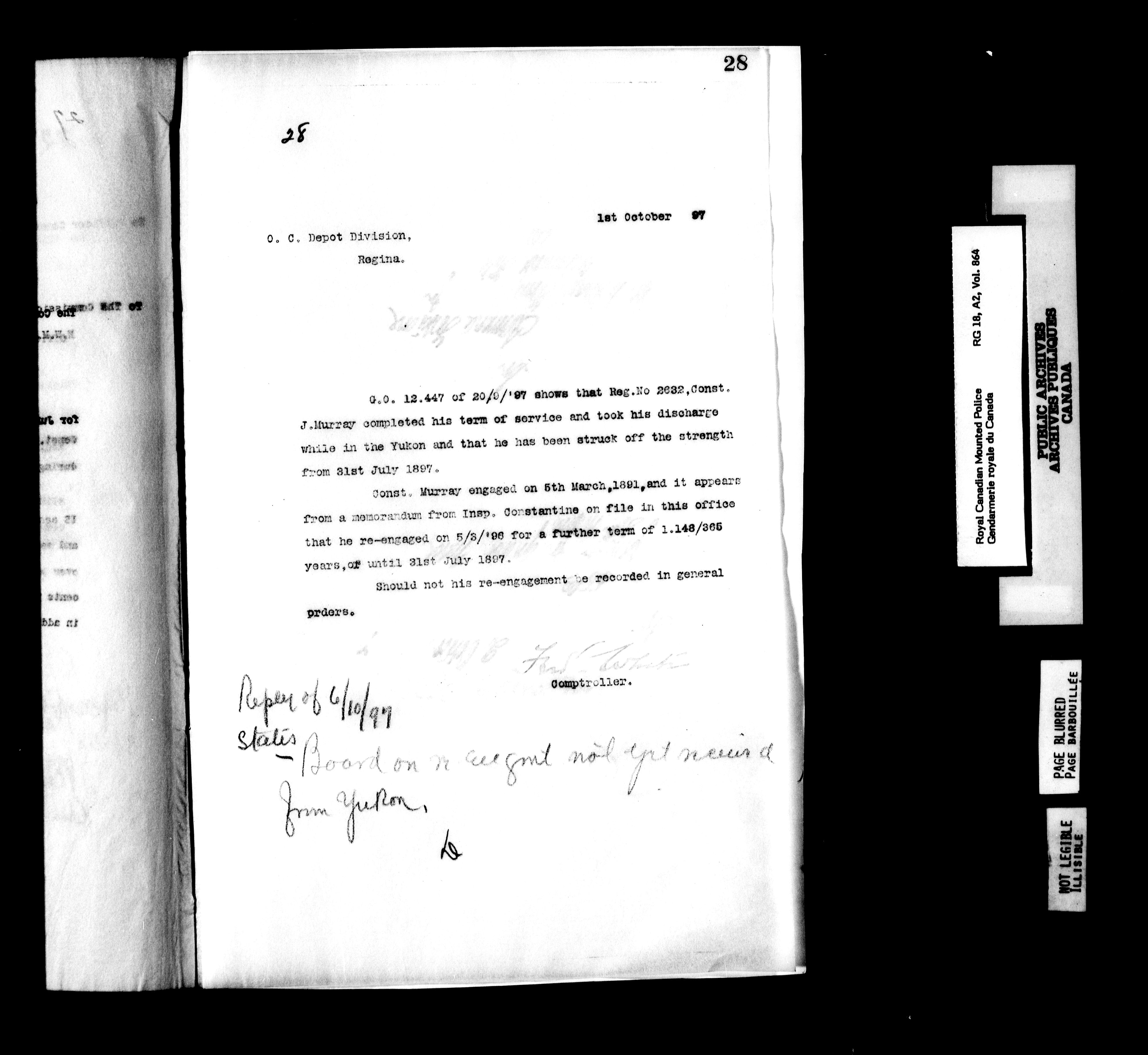 Royal Canadian Mounted Police, Office of the Comptroller : Correspondence relating to personnel, pay, and kit, 1894-1914 - 6247