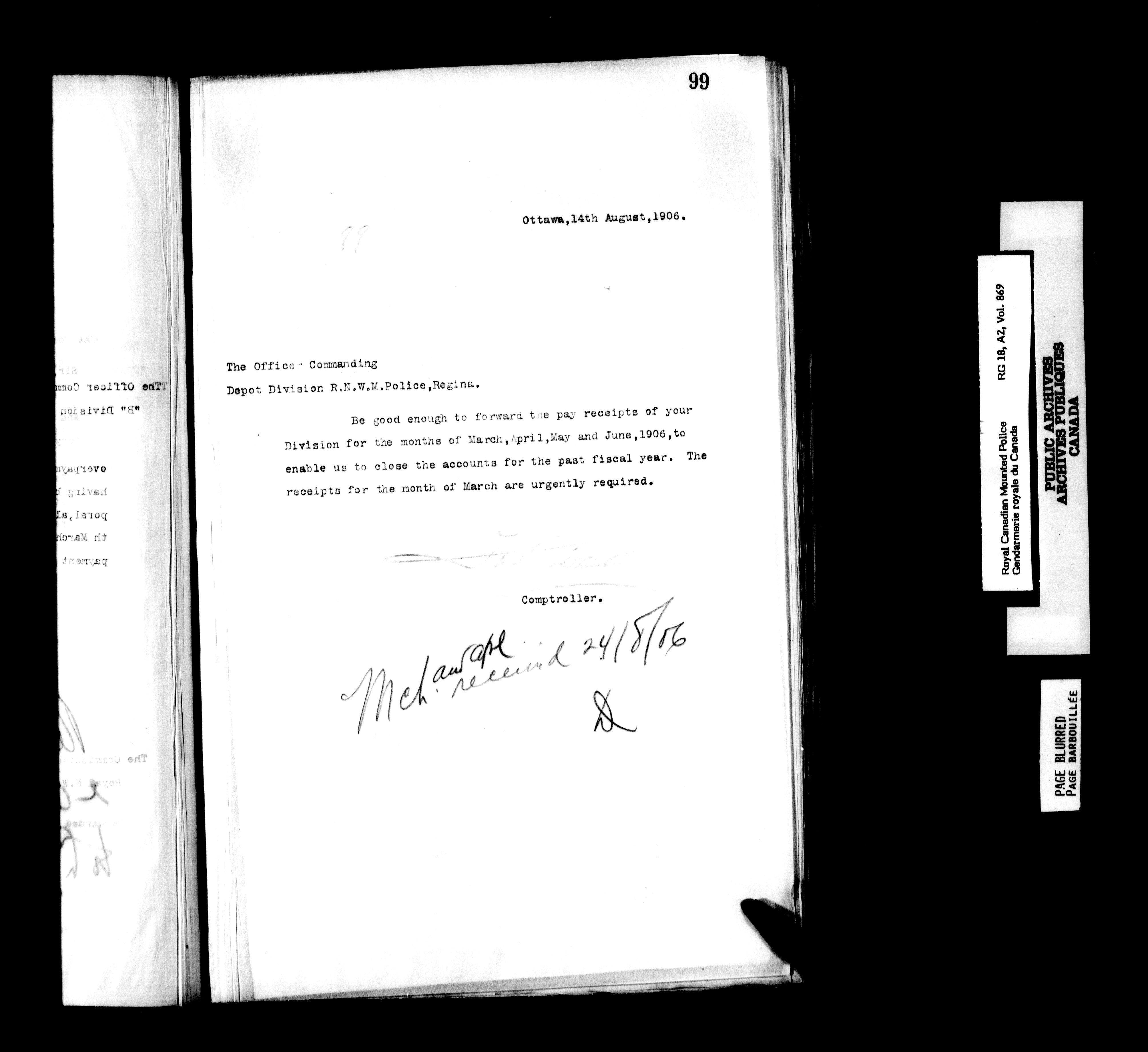 Royal Canadian Mounted Police, Office of the Comptroller : Correspondence relating to personnel, pay, and kit, 1894-1914 - 6249