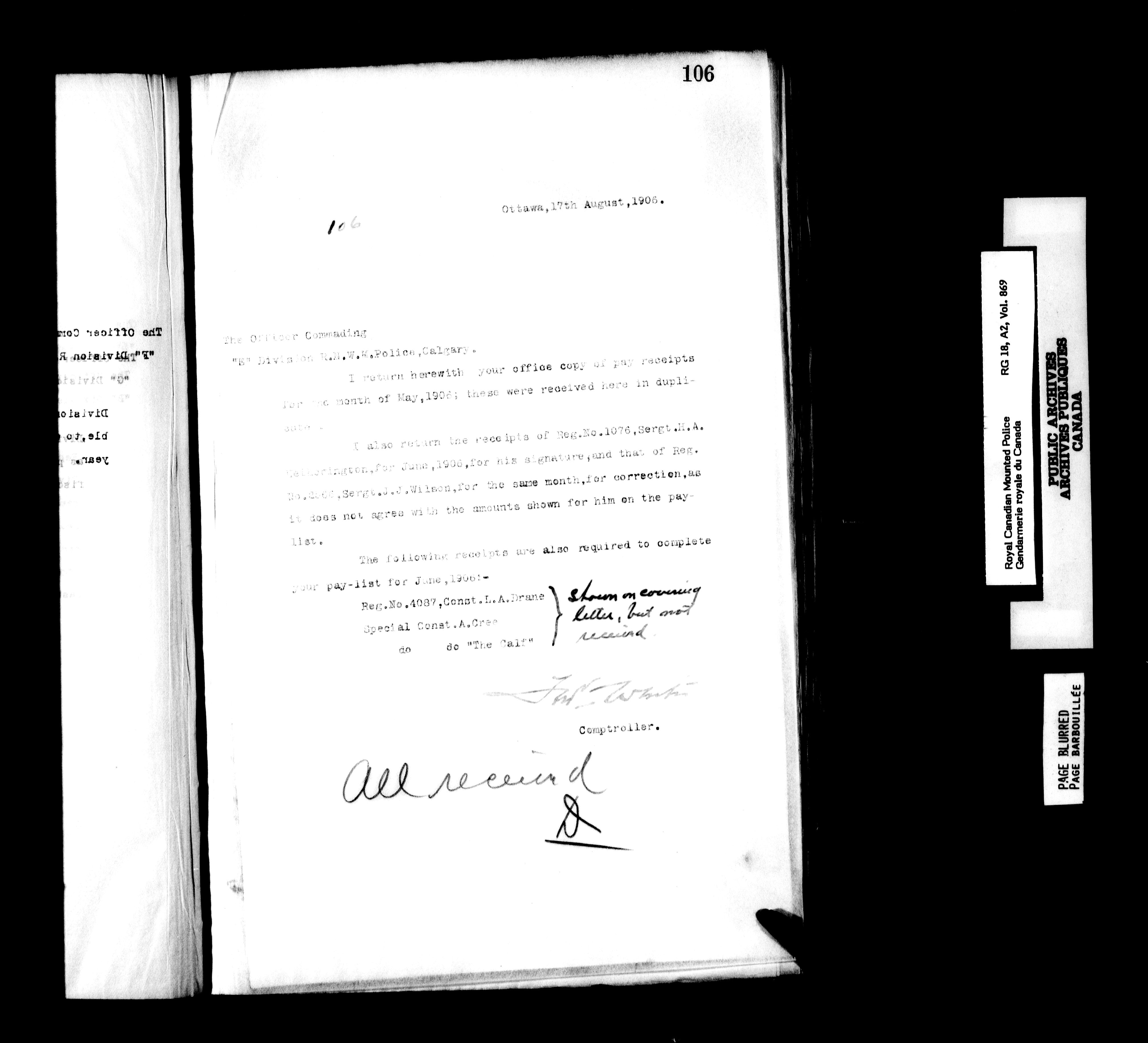 Royal Canadian Mounted Police, Office of the Comptroller : Correspondence relating to personnel, pay, and kit, 1894-1914 - 6249