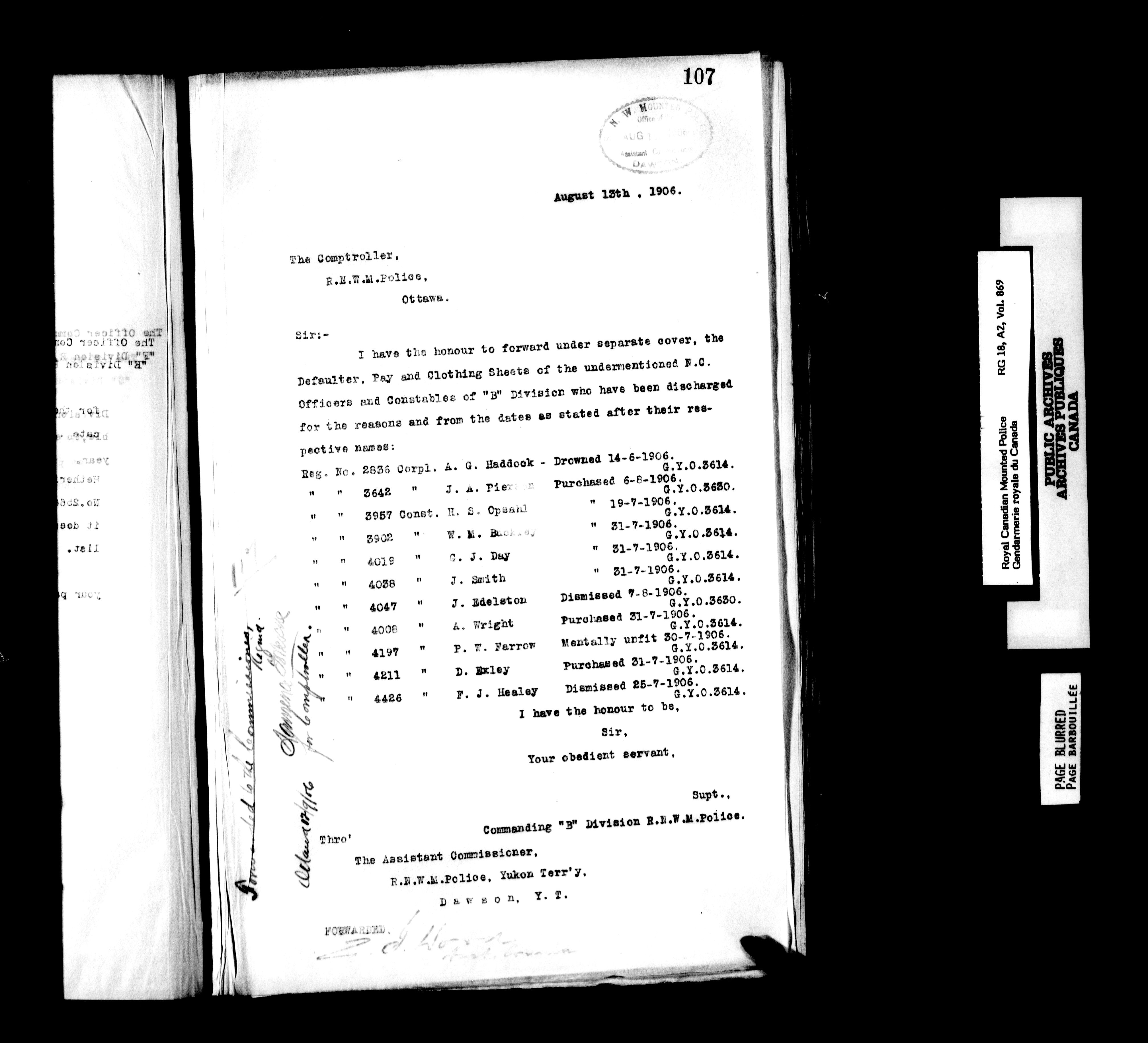 Royal Canadian Mounted Police, Office of the Comptroller : Correspondence relating to personnel, pay, and kit, 1894-1914 - 6249