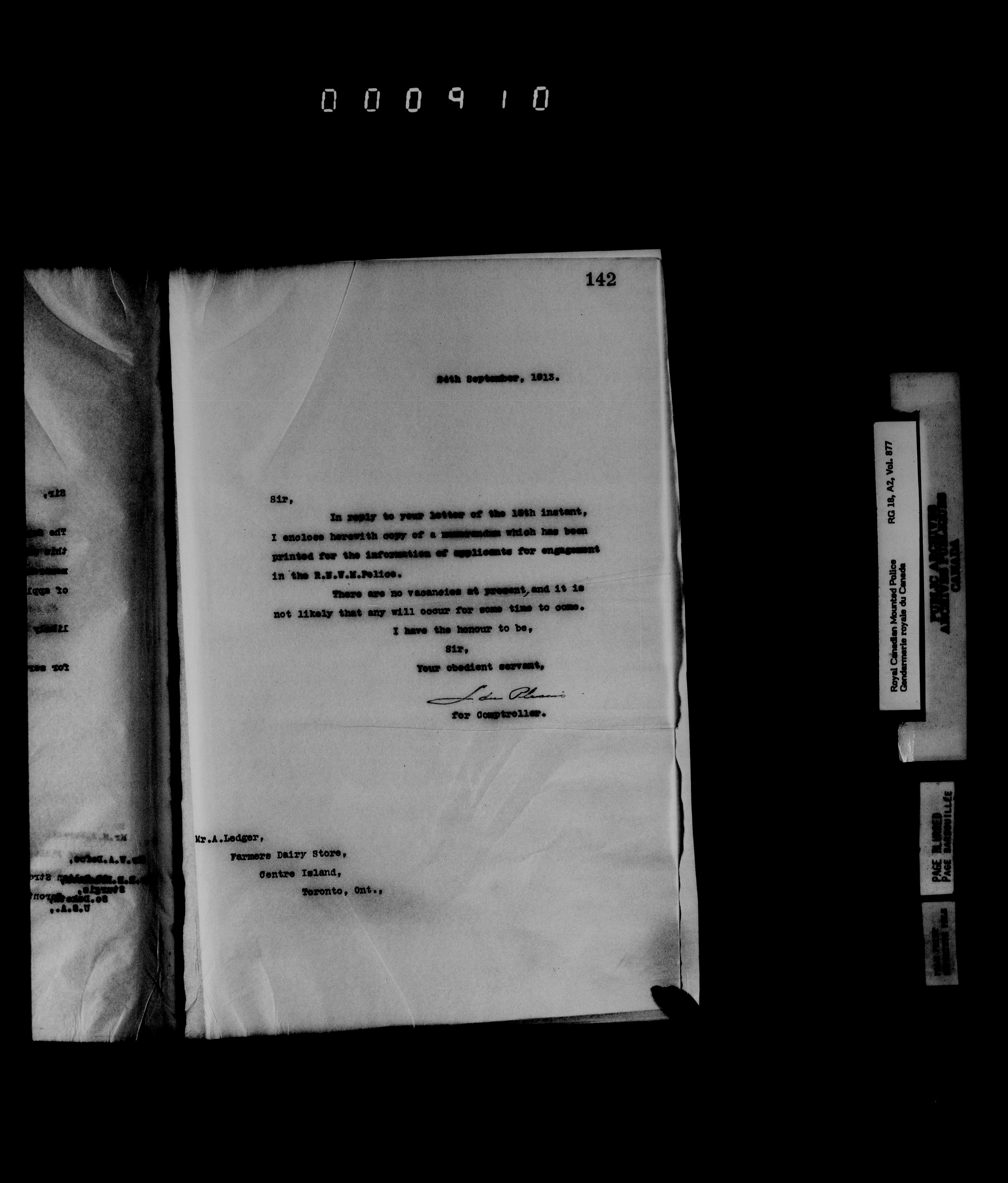 Royal Canadian Mounted Police, Office of the Comptroller : Correspondence relating to personnel and recruiting, 1895-1919 - 6255