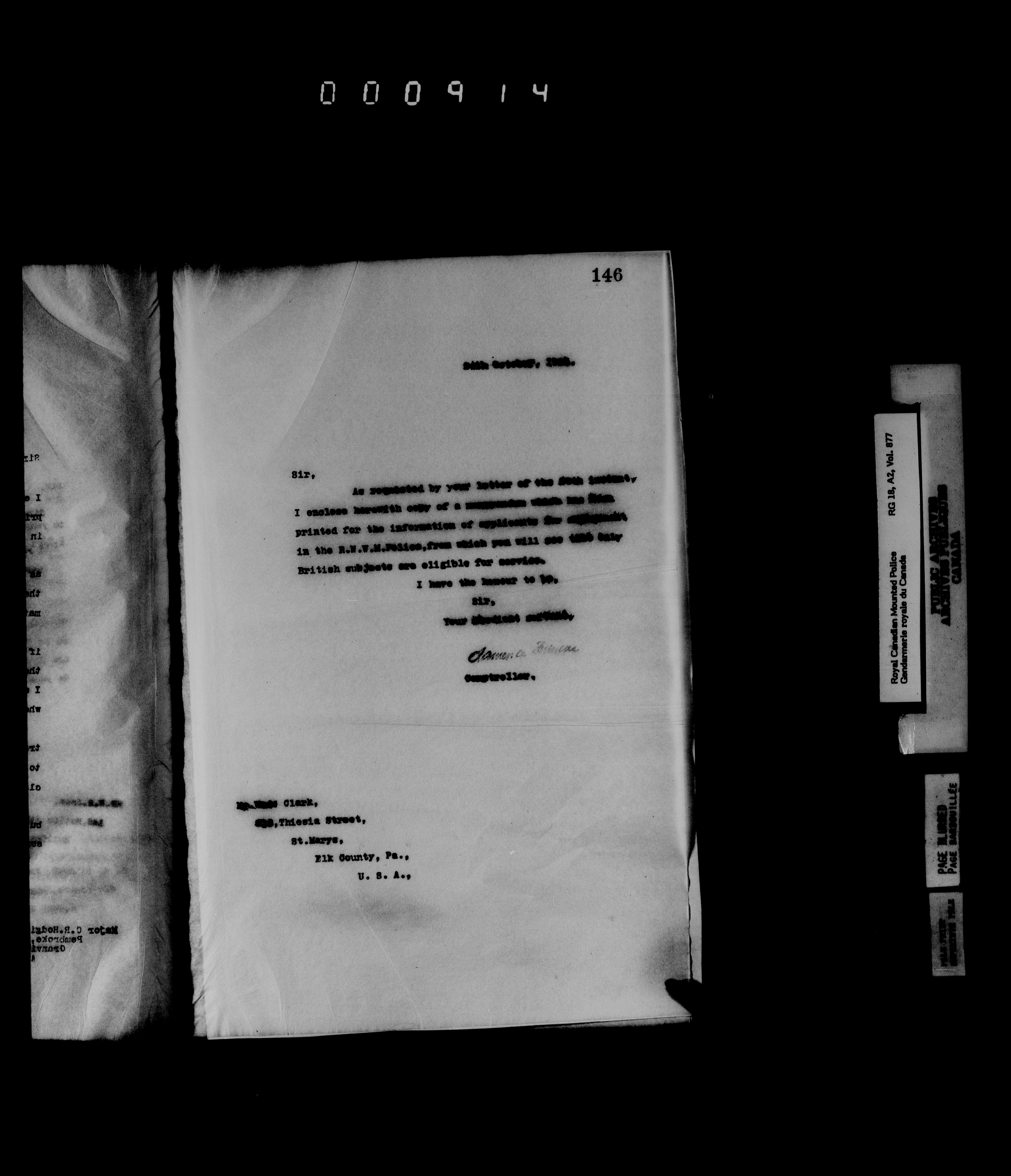 Royal Canadian Mounted Police, Office of the Comptroller : Correspondence relating to personnel and recruiting, 1895-1919 - 6255