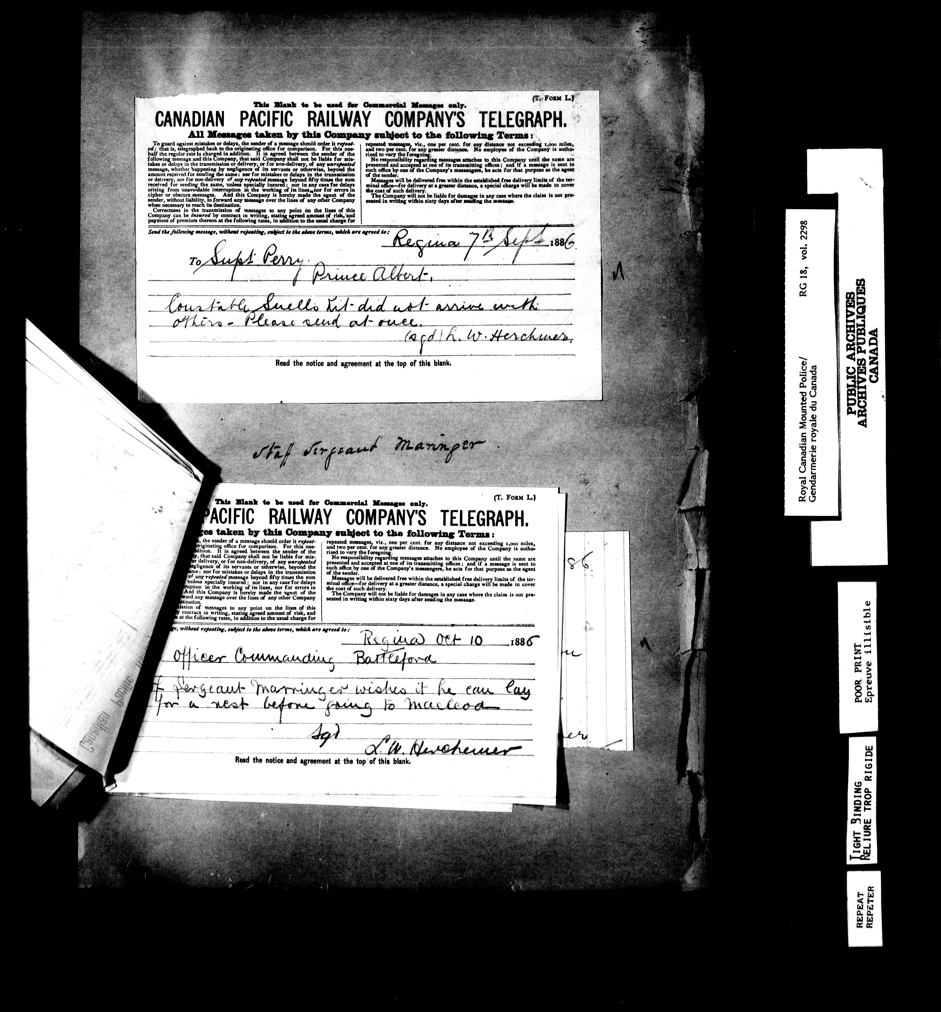 Northwest Mounted Police : Telegrams of the Commissioner's Office, 1882-1919 - 6960