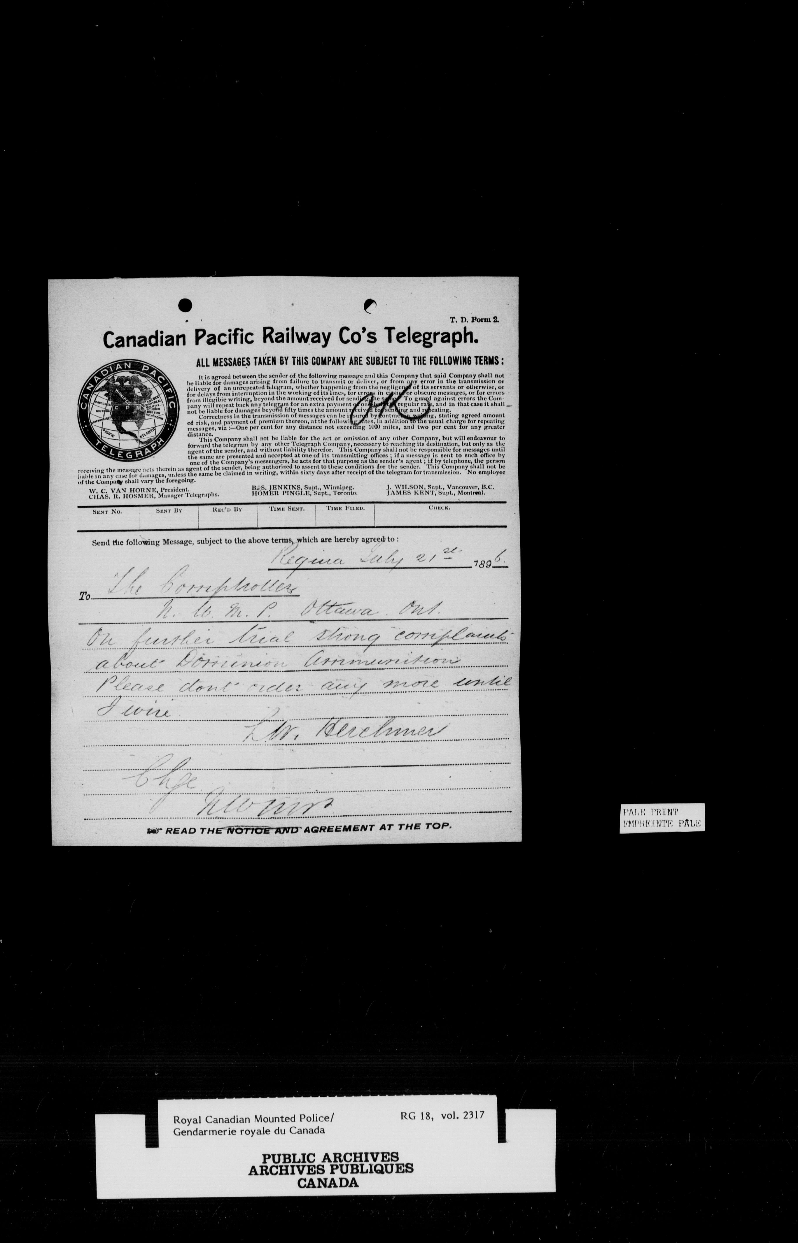Northwest Mounted Police : Telegrams of the Commissioner's Office, 1882-1919 - 6974