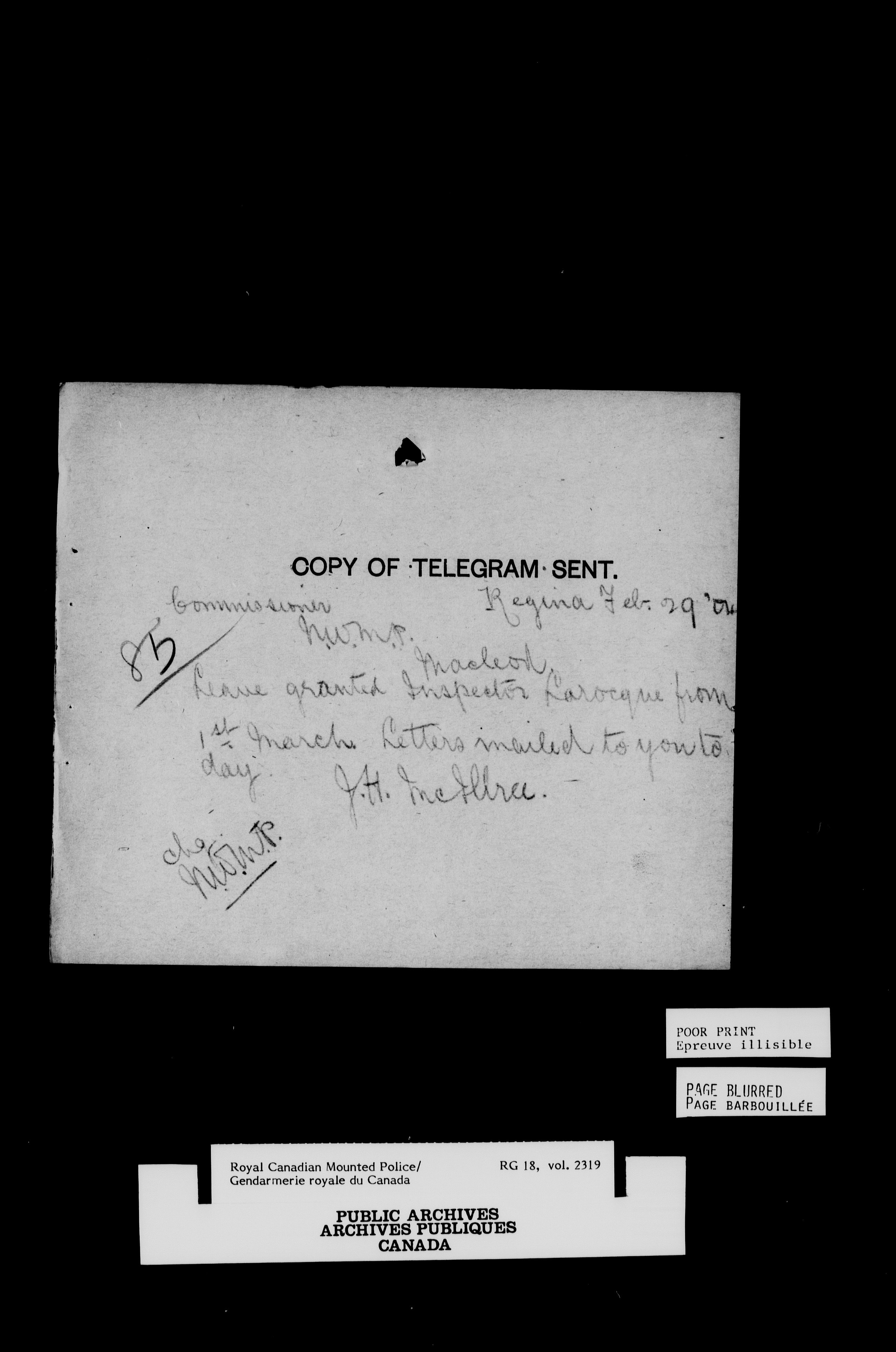 Royal Canadian Mounted Police, Office of the Commissioner: letterbooks relating to sick horses : T-6976