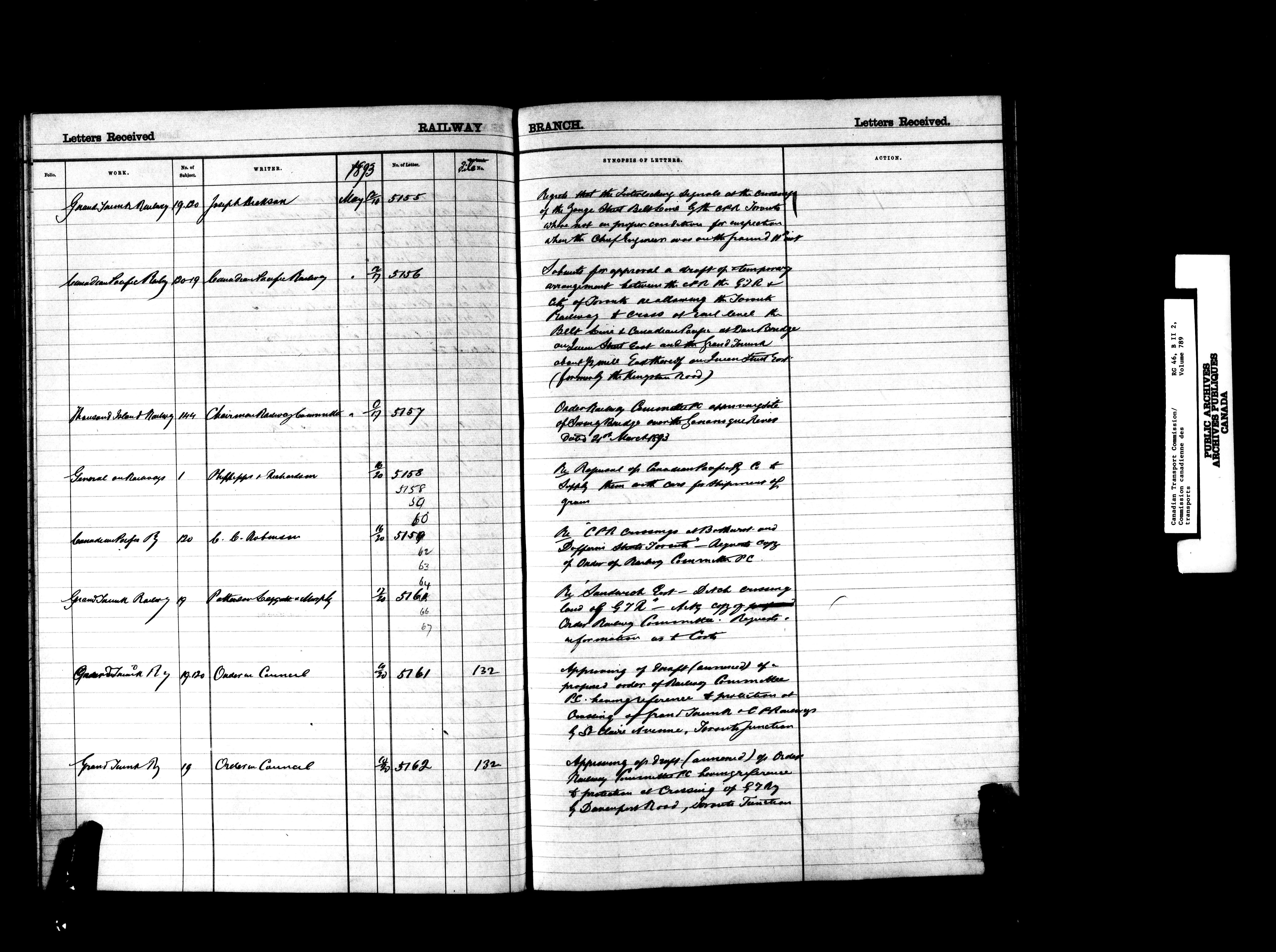 Railway Committee of the Privy Council : Registers of letters received, 1867-1903 - 7199
