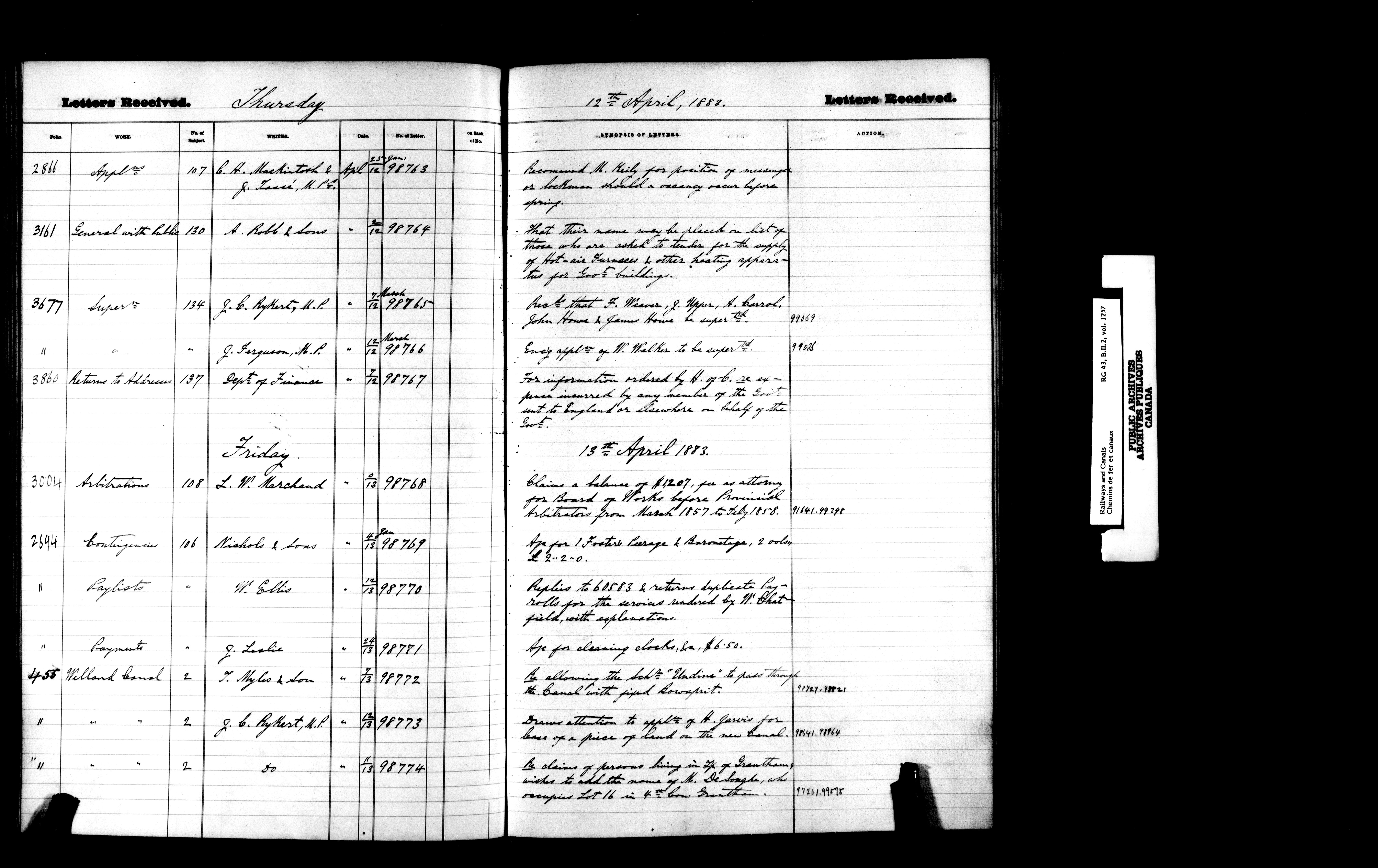 Department of Railways and Canals, Canal Branch : Registers of letters received between January 1881 and December 1892 - 7202