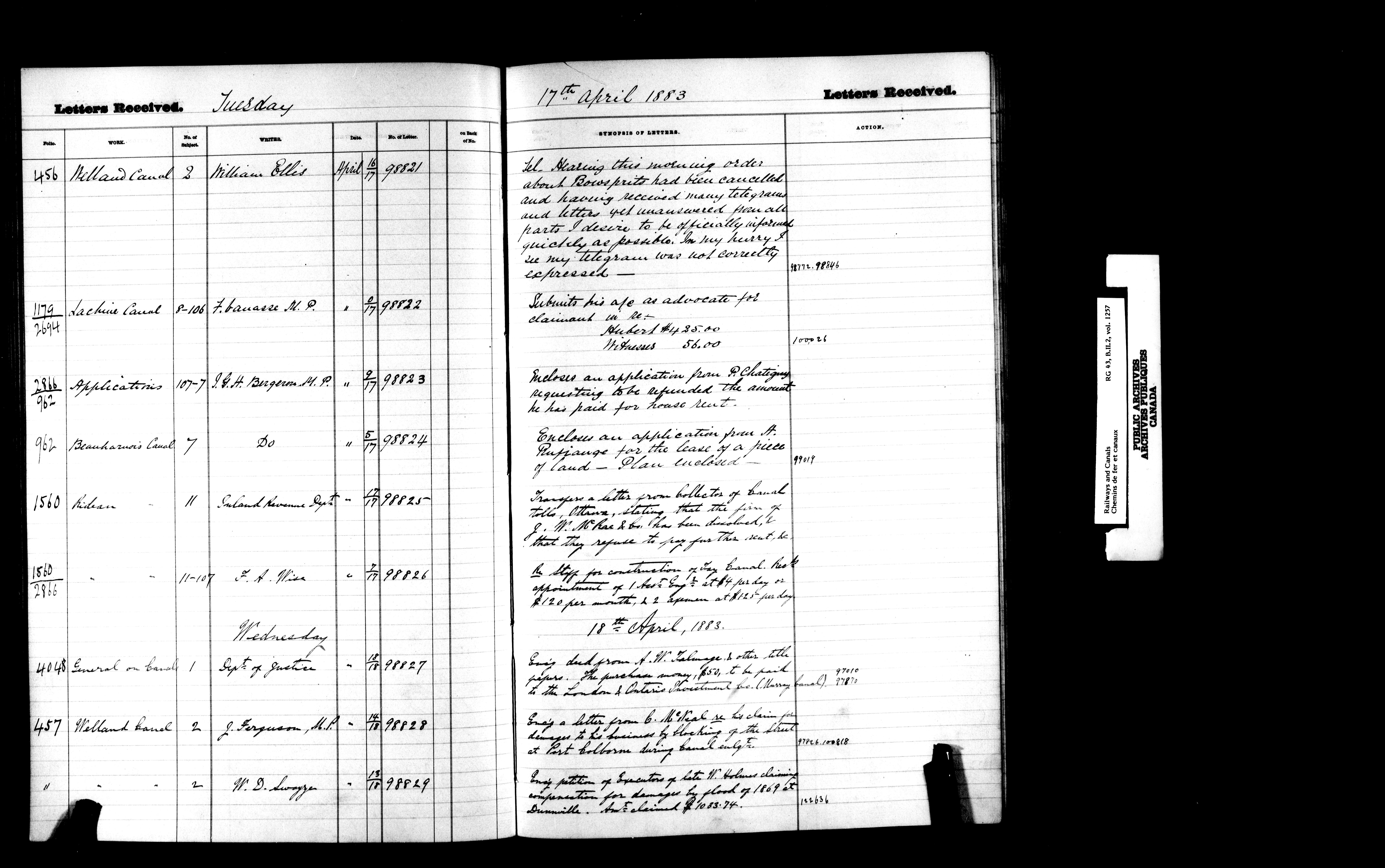Department of Railways and Canals, Canal Branch : Registers of letters received between January 1881 and December 1892 - 7202
