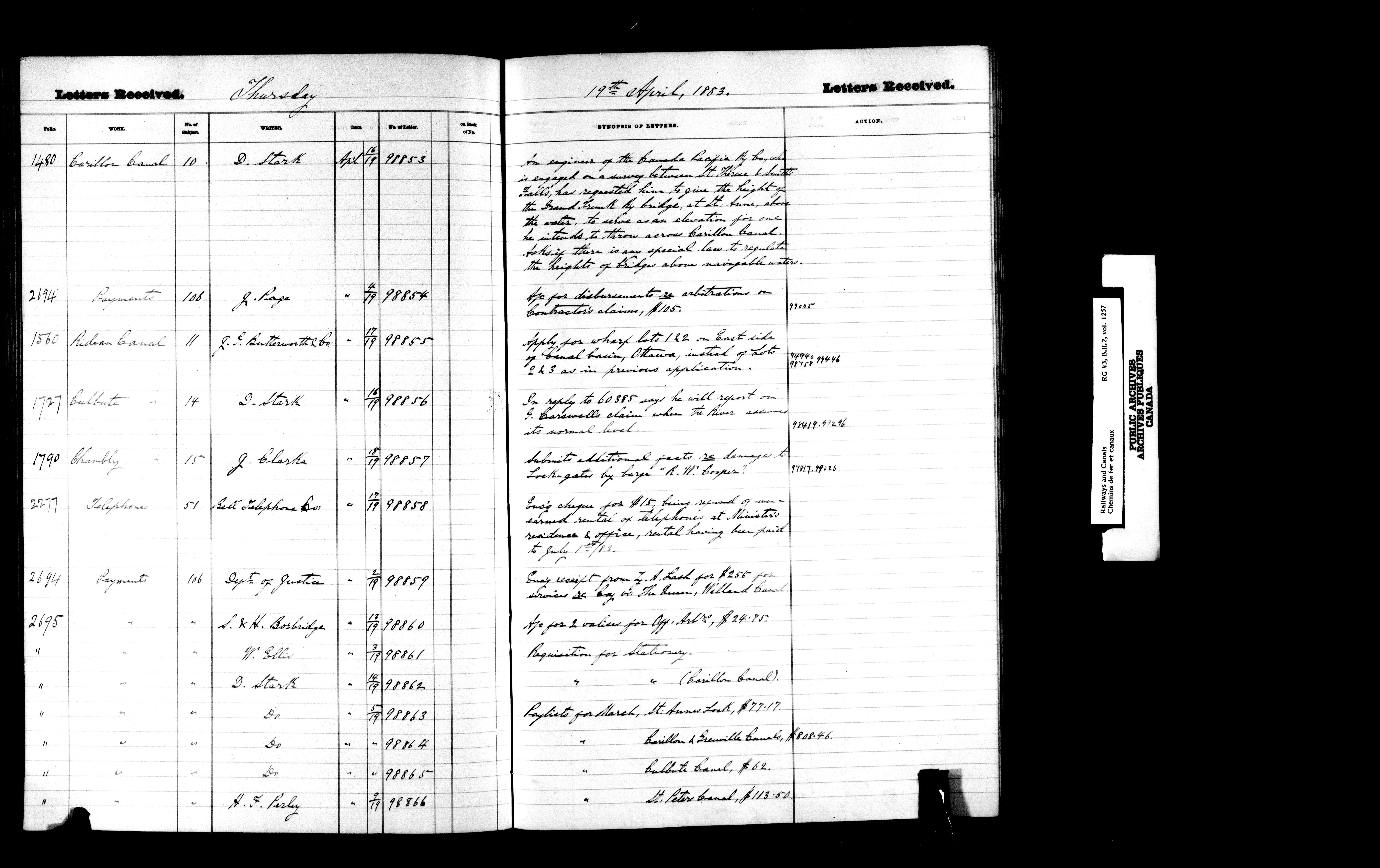 Department of Railways and Canals, Canal Branch : Registers of letters received between January 1881 and December 1892 - 7202