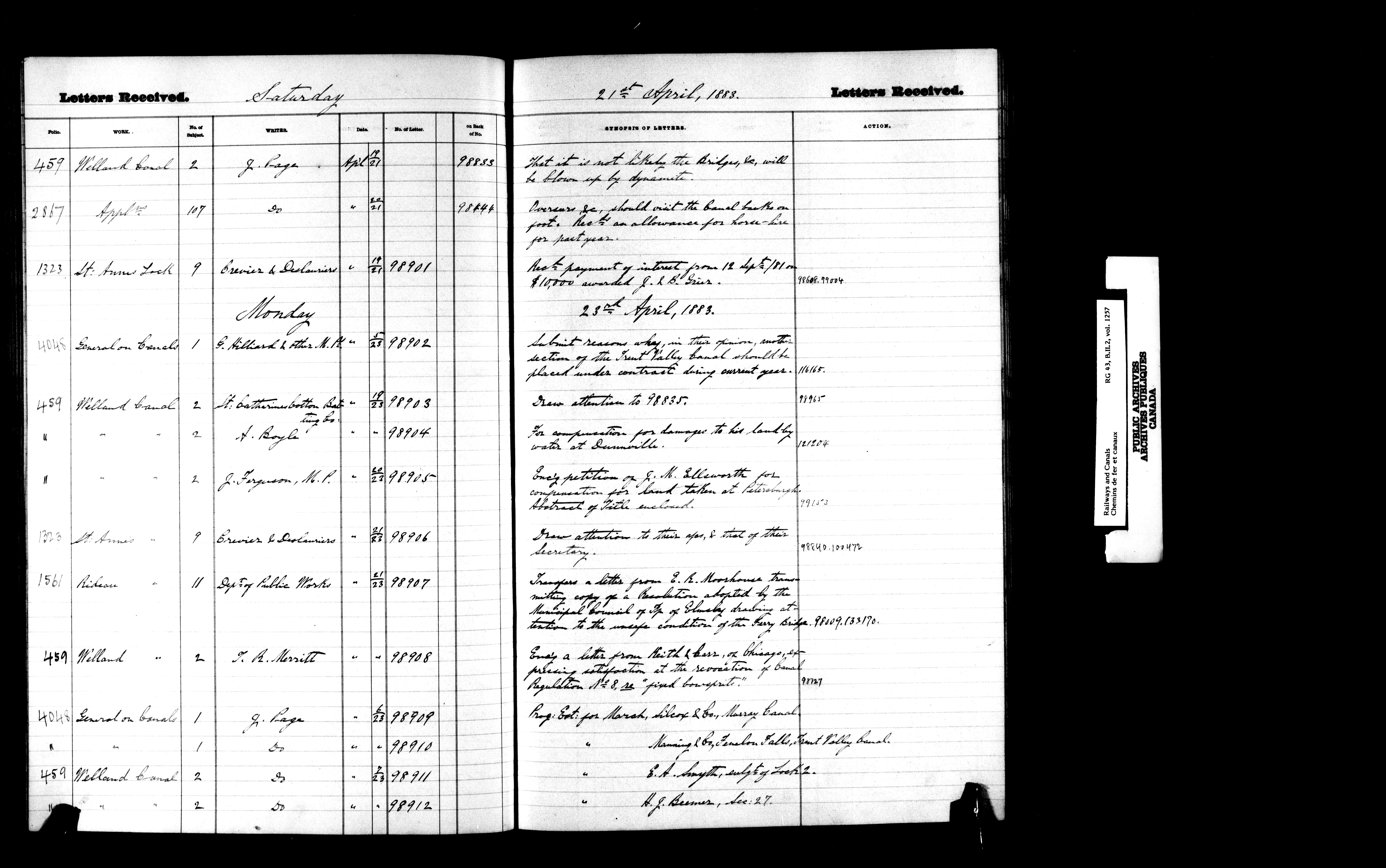 Department of Railways and Canals, Canal Branch : Registers of letters received between January 1881 and December 1892 - 7202