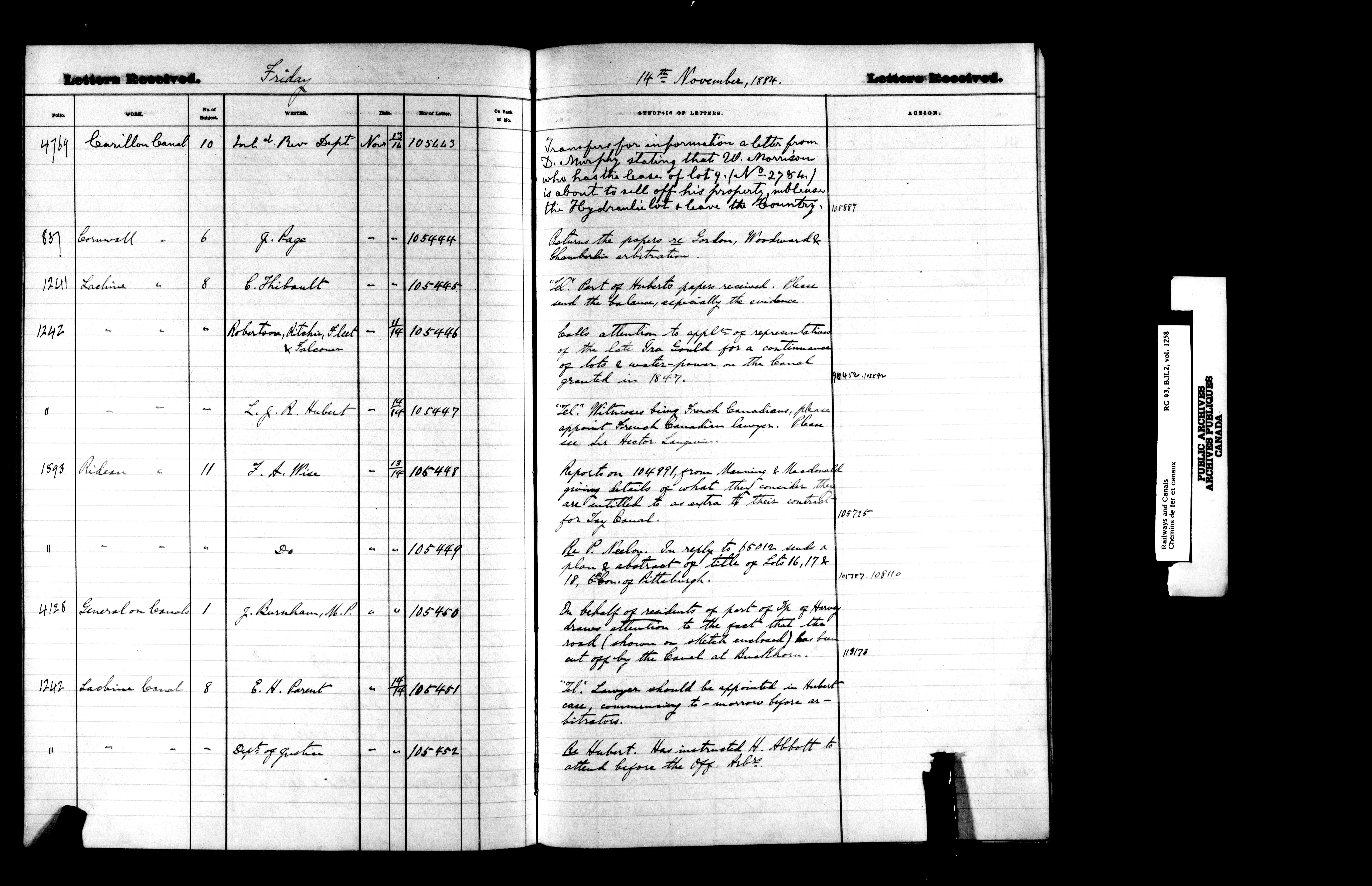Department of Railways and Canals, Canal Branch : Registers of letters received between January 1881 and December 1892 - 7203