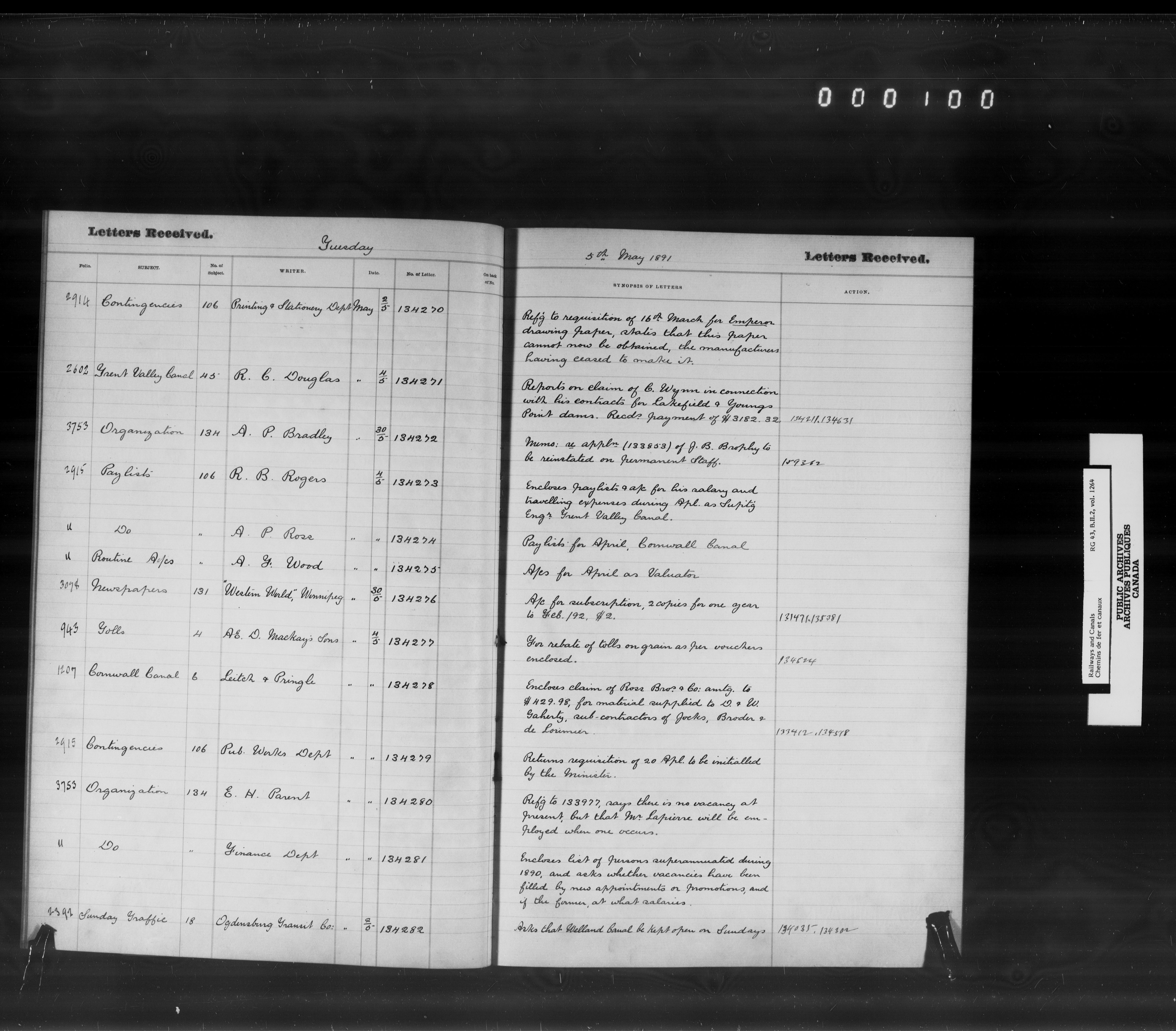 Department of Railways and Canals, Canal Branch : Registers of letters received between January 1881 and December 1892 - 7207