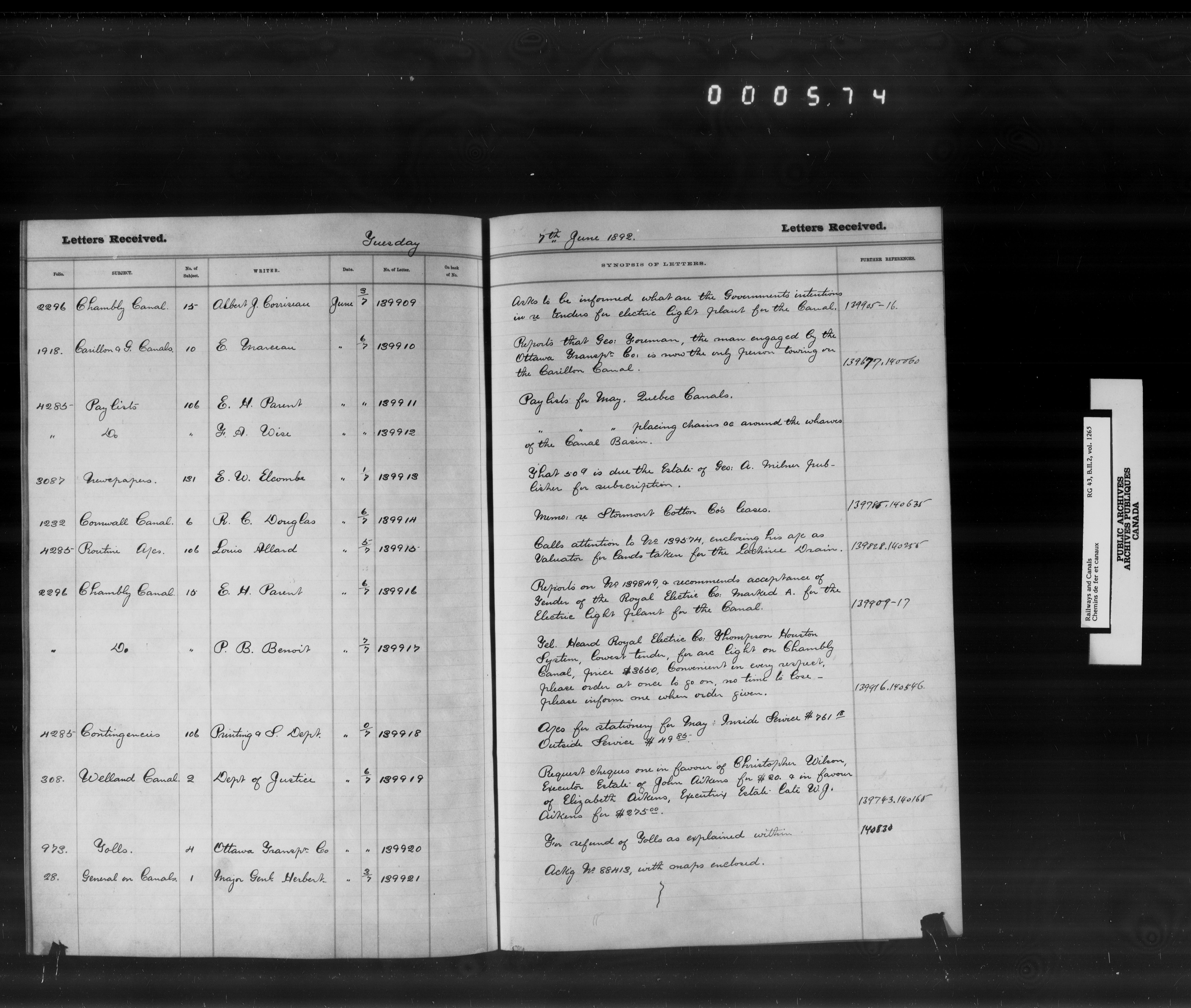 Department of Railways and Canals, Canal Branch : Registers of letters received between January 1881 and December 1892 - 7207